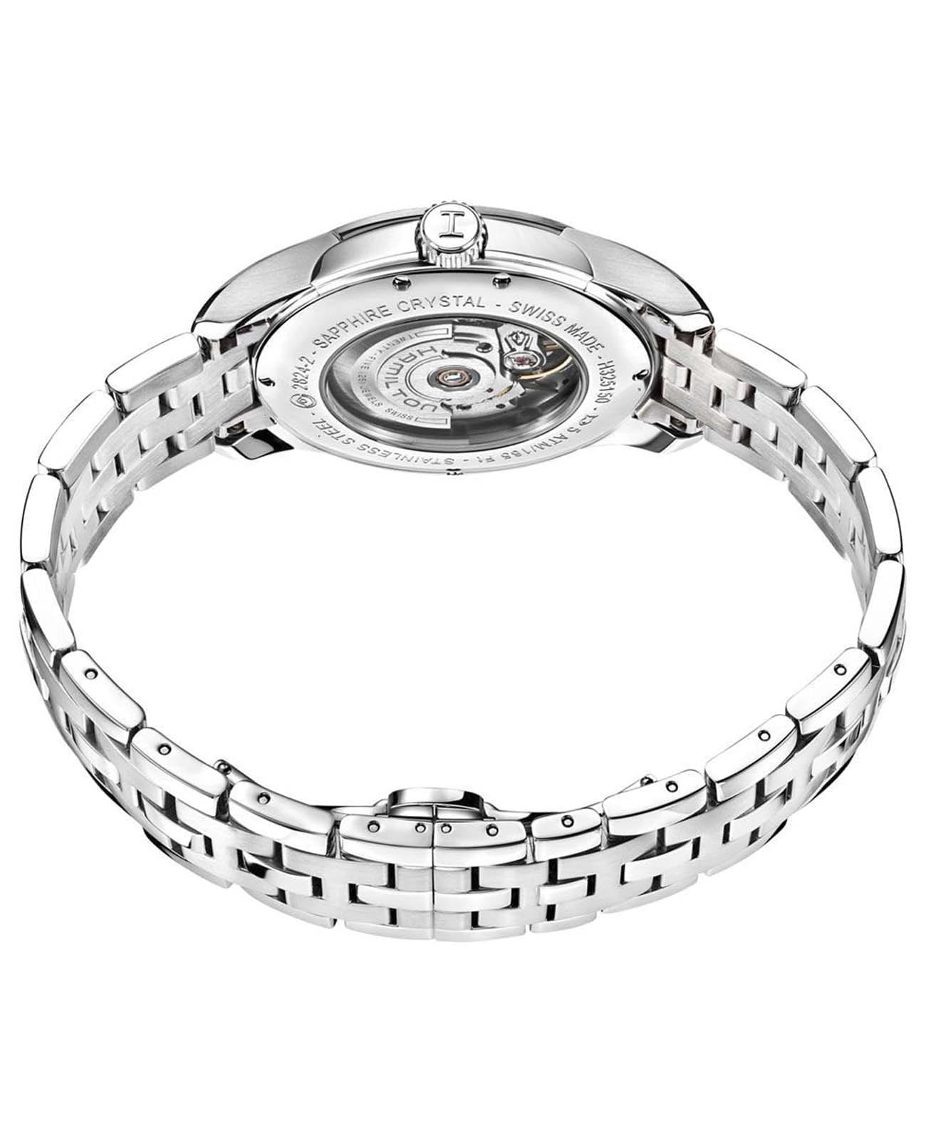 Мужские наручные часы Hamilton Jazzmaster Viewmatic Auto H32515155 с автоматическим механизмом. Корпус часов выполнен из нержавеющей стали. Стальной браслет на застёжке-бабочке с кнопкамиЗастёжка "бабочка"Такой вид застёжки дополняется предохранителями, помогающими избежать случайного раскрытия браслета. Обладают изящным исполнением. . Стрелки и метки с люминесцентным покрытиемЛюминесцентное покрытиеПозволяет считывать показания времени в темноте. Производители наносят на стрелки, часовые индексы, безель или поверхность циферблата светонакопительный состав, дающий холодное свечение.. Сапфировое стеклоСапфировое стеклоПрочный и надёжный материал из кристалла сапфира синтетического происхождения, характеризующийся особой твёрдостью и устойчивостью к царапинам и повреждениям. с антибликовым покрытием. Уровень влагозащиты: 50 метров, позволит защитить корпус от случайных брызг или капель дождя. Окошко даты находится в положении 3 часа.