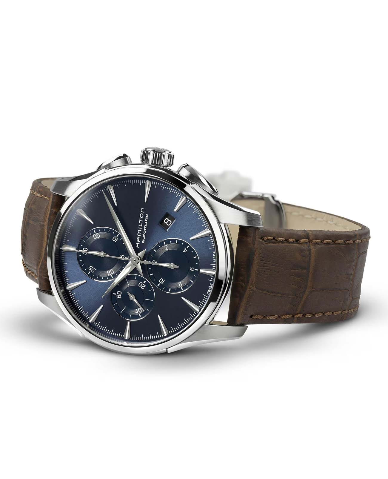 Часы-хронографХронографФункция позволяет измерять отрезки времени с особой точностью: часы, минуты, секунды. Верным признаком хронографа является наличие на циферблате 3 дополнительных окошек-счётчиков. Hamilton Jazzmaster Auto Chrono H32586541 с автоматическим механизмом высокой точности. Сапфировое стеклоСапфировое стеклоПрочный и надёжный материал из кристалла сапфира синтетического происхождения, характеризующийся особой твёрдостью и устойчивостью к царапинам и повреждениям. устойчивое к появлению царапин, обладающее высокой прозрачностью. Класс водозащиты: 100 метров, позволит плавать, нырять и заниматься другими водными видами спорта. Корпус часов изготовлен из нержавеющей стали. Практичный кожаный ремешок с раскладной застёжкойРаскладная застёжкаТакой тип застёжки используется только на браслетах из металла. Она никогда не раскрывается полностью, происходит разделение на 2 и более частей. Раскладывающая застёжка снизит вероятность потери часов к минимуму.. Стрелки и метки с люминесцентным покрытиемЛюминесцентное покрытиеПозволяет считывать показания времени в темноте. Производители наносят на стрелки, часовые индексы, безель или поверхность циферблата светонакопительный состав, дающий холодное свечение.. Окошко даты находится в положении 4 часа.