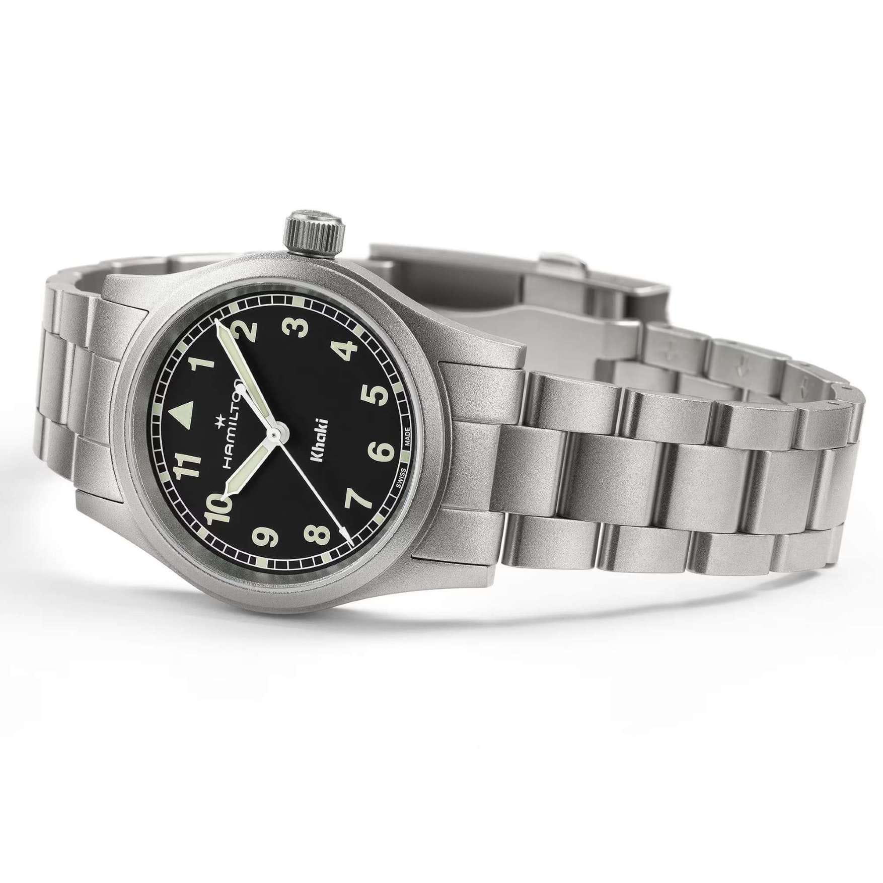 Hamilton Khaki Field Quartz 33mm H69301130 — компактные и универсальные часы в классическом военном стиле, с акцентом на надёжность и практичность. Изысканный корпус диаметром 33 мм выполнен из нержавеющей стали, лёгкий, удобный и идеально подходит для запястий любого размера. Циферблат защищён сапфировым стекломСапфировое стеклоПрочный и надёжный материал из кристалла сапфира синтетического происхождения, характеризующийся особой твёрдостью и устойчивостью к царапинам и повреждениям., устойчивым к царапинам и бликам. Циферблат оформлен в классическом армейском стиле: крупные арабские цифры, стрелки и метки с люминесцентным покрытиемЛюминесцентное покрытиеПозволяет считывать показания времени в темноте. Производители наносят на стрелки, часовые индексы, безель или поверхность циферблата светонакопительный состав, дающий холодное свечение. Super-LumiNova®, обеспечивающим превосходную видимость в темноте. Внутри установлен швейцарский кварцевый калибр ETA F05.105mh2. Модель укомплектована браслетом из нержавеющей стали с раскладной застёжкойРаскладная застёжкаТакой тип застёжки используется только на браслетах из металла. Она никогда не раскрывается полностью, происходит разделение на 2 и более частей. Раскладывающая застёжка снизит вероятность потери часов к минимуму., обеспечивающей надёжную посадку. Водонепроницаемость 50 метров делает часы устойчивыми к брызгам и дождю, идеально подходящими для повседневного ношения. Khaki Field Quartz 33 мм — надёжный выбор для тех, кто ценит простоту, точность и долговечность.