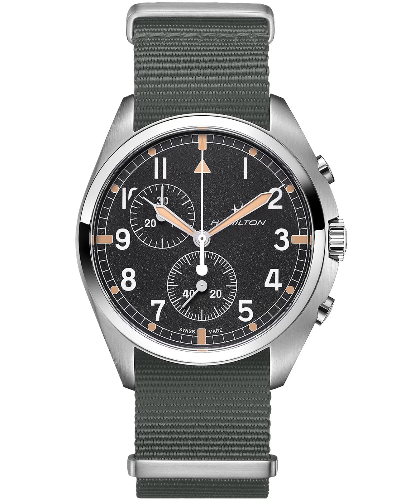 Мужские швейцарские часы-хронографХронографФункция позволяет измерять отрезки времени с особой точностью: часы, минуты, секунды. Верным признаком хронографа является наличие на циферблате 3 дополнительных окошек-счётчиков. с секундомеромСекундомерСекундоме́р — прибор, способный измерять интервалы времени с точностью до долей секунды. и надёжным кварцевым механизмом Hamilton Khaki Aviation Pilot Pioneer Chrono Quartz H76522931. Сапфировое стеклоСапфировое стеклоПрочный и надёжный материал из кристалла сапфира синтетического происхождения, характеризующийся особой твёрдостью и устойчивостью к царапинам и повреждениям. устойчивое к появлению царапин, обладающее высокой прозрачностью. Класс водозащиты: 100 метров, позволит плавать, нырять и заниматься другими водными видами спорта. Корпус часов изготовлен из стали. Тканевый ремешок на стандартной застёжке. Стрелки и метки с люминесцентным покрытиемЛюминесцентное покрытиеПозволяет считывать показания времени в темноте. Производители наносят на стрелки, часовые индексы, безель или поверхность циферблата светонакопительный состав, дающий холодное свечение..