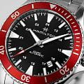 Часы Hamilton Khaki Navy Scuba Automatic (H82405130) сочетают функциональность дайверских часов с ярким дизайном, заключены в 40-мм корпус из нержавеющей стали с красным алюминиевым безелемБезельВнешний ободок, закрепляющий стекло. В спортивных часах так называется поворотное кольцо с делениями на циферблате, выполняет роль таймера – замеряет отрезки времени на шкале. Неподвижный безель – элемент декора. Однонаправленно вращающийся безель на дайверских часах позволяет фиксировать моменты погружения и выныривания на поверхность., вдохновлённого морской тематикой. Модель оснащена автоматическим калибром H-10 с увеличенным запасом хода 80 часов и спиралью баланса Nivachron™Nivachron™Специально разработанный инновационный сплав Nivachron™ повышает устойчивость часов к воздействию магнитных полей., обеспечивающей устойчивость к магнитным полям и температурным перепадам. Чёрный циферблат с люминесцентными метками Super-LumiNova гарантирует чёткую видимость в темноте, а сапфировое стеклоСапфировое стеклоПрочный и надёжный материал из кристалла сапфира синтетического происхождения, характеризующийся особой твёрдостью и устойчивостью к царапинам и повреждениям. с антибликовым покрытиемАнтибликовое покрытиеСлой оксида металла в 0,13-0,3 микрон, благодаря которому стекло часов не бликует и не отражает свет. Антибликовое покрытие уменьшает отражение света в 10 раз, обеспечивая отличную читаемость показателей циферблата. защищает от царапин. Водонепроницаемость до 100 метров (10 бар) делает часы надёжным спутником для плавания. Комплектуется стальным браслетом шириной 20 мм с раскладной застёжкойРаскладная застёжкаТакой тип застёжки используется только на браслетах из металла. Она никогда не раскрывается полностью, происходит разделение на 2 и более частей. Раскладывающая застёжка снизит вероятность потери часов к минимуму., сочетающим комфорт и долговечность.