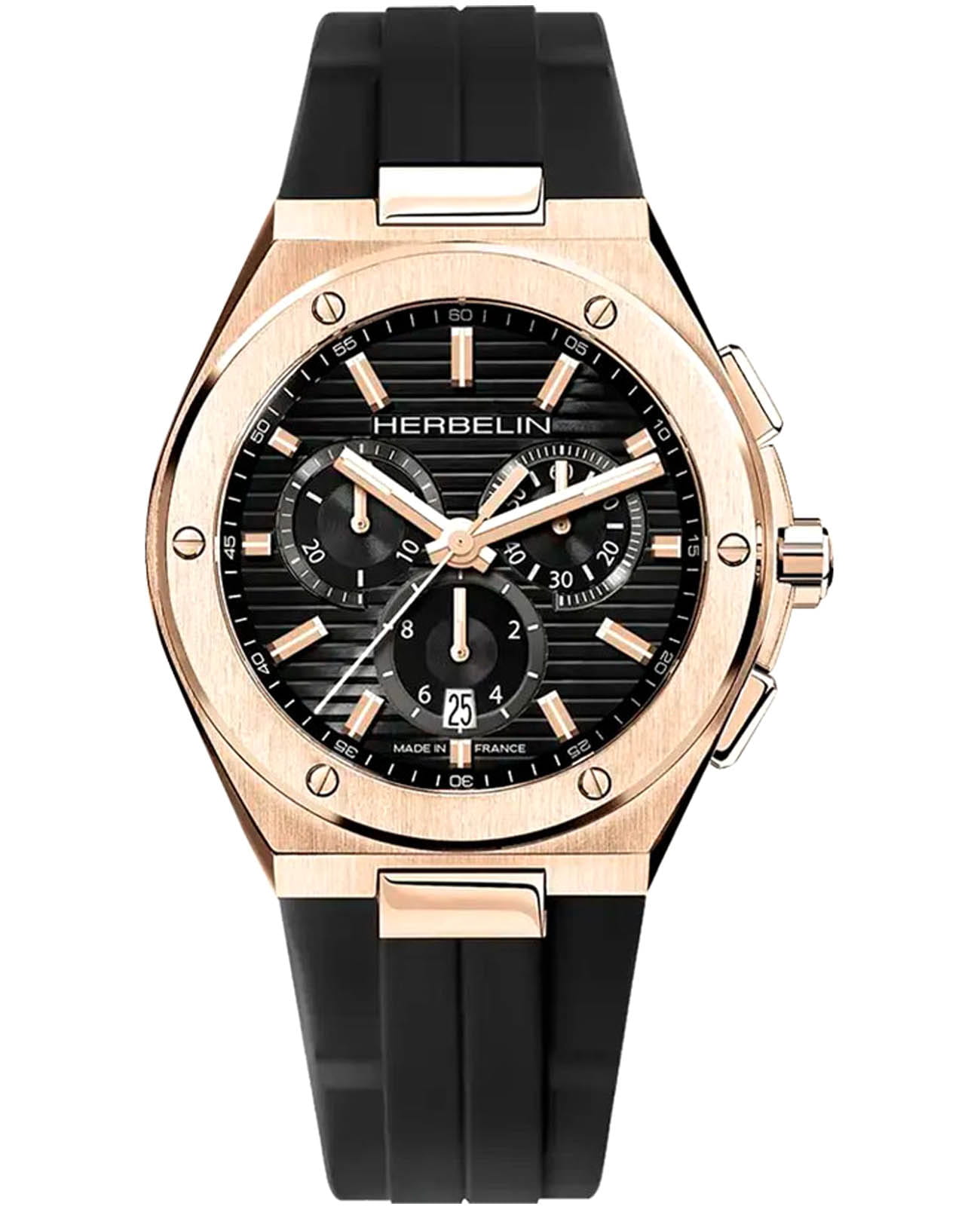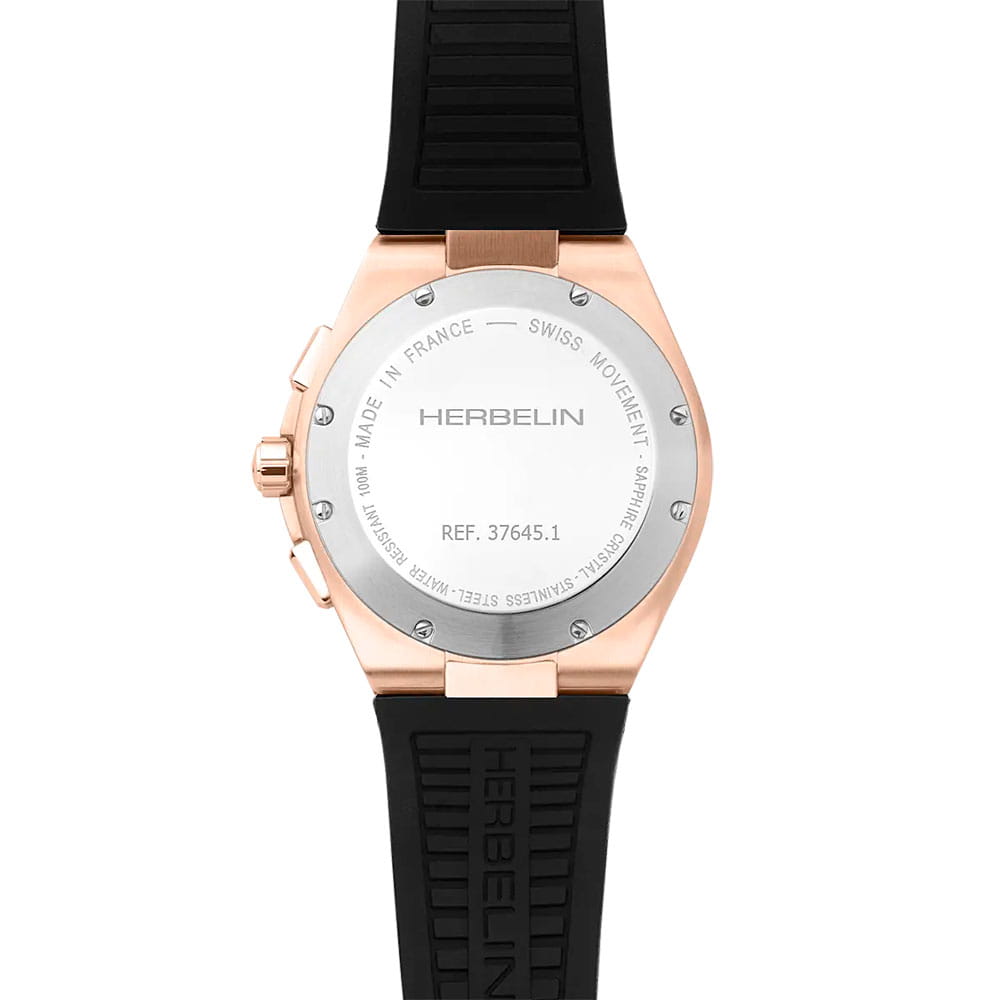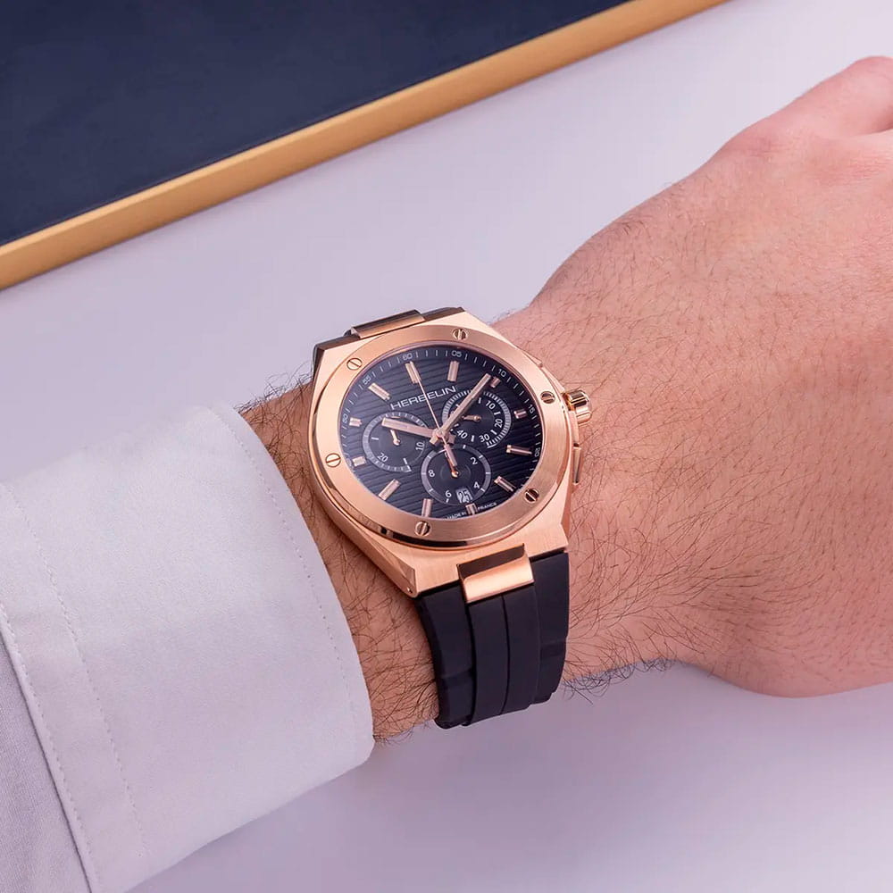 Мужские кварцевые наручные часы-хронографХронографФункция позволяет измерять отрезки времени с особой точностью: часы, минуты, секунды. Верным признаком хронографа является наличие на циферблате 3 дополнительных окошек-счётчиков. Herbelin Cap Camarat 37645PR14CA – отражающий идеальное сочетание современного дизайна, надёжности и функциональности. Элегантный облик станет превосходным завершением образа, наделив его индивидуальным характером. Корпус из нержавеющей стали с PVD-покрытиемPVDУльтратонкое покрытие наносится в технике вакуумного напыления, сочетает в себе нитрид титана особой прочности со слоем золота или оксида хрома. Несёт в себе декоративную или защитную функцию. цвета розового золота, диаметром 42 мм, идеально сбалансирован и элегантен. Сапфировое стеклоСапфировое стеклоПрочный и надёжный материал из кристалла сапфира синтетического происхождения, характеризующийся особой твёрдостью и устойчивостью к царапинам и повреждениям. защищает циферблат от царапин и устойчивое к механическим повреждениям. БезельБезельВнешний ободок, закрепляющий стекло. В спортивных часах так называется поворотное кольцо с делениями на циферблате, выполняет роль таймера – замеряет отрезки времени на шкале. Неподвижный безель – элемент декора. Однонаправленно вращающийся безель на дайверских часах позволяет фиксировать моменты погружения и выныривания на поверхность. украшен винтами, заводная головка с защитой. Окошко даты находится в положении 6 часов. Стрелки и метки с люминесцентным покрытиемЛюминесцентное покрытиеПозволяет считывать показания времени в темноте. Производители наносят на стрелки, часовые индексы, безель или поверхность циферблата светонакопительный состав, дающий холодное свечение.. Каучуковый ремешок на стандартной застежке обеспечивает комфортное ношение. Водозащита 100 метров позволит плавать, нырять и заниматься другими водными видами спорта. Эта модель – отличный выбор для тех, кто ищет сочетание стиля, качества и функциональности. Часы станут не только полезным аксессуаром, но и выразительным элементом вашего имиджа.