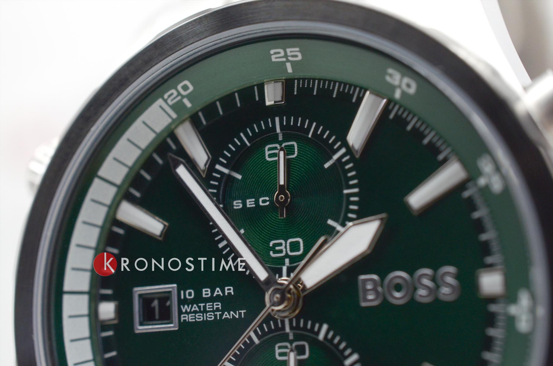 Мужские часы Hugo Boss Globetrotter HB 1513930 представлены в круглом 46-мм корпусе из нержавеющей стали с IP-покрытиемIP-покрытиеМетод ионного напыления. Демонстрирует повышенную устойчивость к истиранию, окислению и химическим веществам. Под воздействием высокого давления и температуры около 1500°C молекулы металла надёжно соединяются с частицами корпуса часов.. Оснащены кварцевым механизмом с функциями хронографаХронографФункция позволяет измерять отрезки времени с особой точностью: часы, минуты, секунды. Верным признаком хронографа является наличие на циферблате 3 дополнительных окошек-счётчиков. и секундомеромСекундомерСекундоме́р — прибор, способный измерять интервалы времени с точностью до долей секунды.. Зеленый циферблат защищен устойчивым к царапинам минеральным стекломМинеральное стеклоМинеральное стекло представляет собой искусственно выращенный минерал кварца. Такое стекло отличается особой устойчивостью к повреждениям и царапинам. Уступает по некоторым качествам сапфировому стеклу.. Стальной браслет серебристого цвета дополнен раскладной застёжкойРаскладная застёжкаТакой тип застёжки используется только на браслетах из металла. Она никогда не раскрывается полностью, происходит разделение на 2 и более частей. Раскладывающая застёжка снизит вероятность потери часов к минимуму., а стрелки покрыты люминесцентным составомЛюминесцентное покрытиеПозволяет считывать показания времени в темноте. Производители наносят на стрелки, часовые индексы, безель или поверхность циферблата светонакопительный состав, дающий холодное свечение. для видимости в темноте. Водонепроницаемость 100 метров (10 ATM) позволяет использовать часы для плавания.