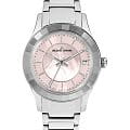 Нежно-розовый циферблат оснащен окошком даты на трех часах, которое выделено накладной рамкой. В каждой, отполированной до зеркального блеска, риске отражается сияние кристаллов Swarovski— на циферблате их ровно двенадцать. Эти кристаллы, помимо декоративной функции, помогают определять время.