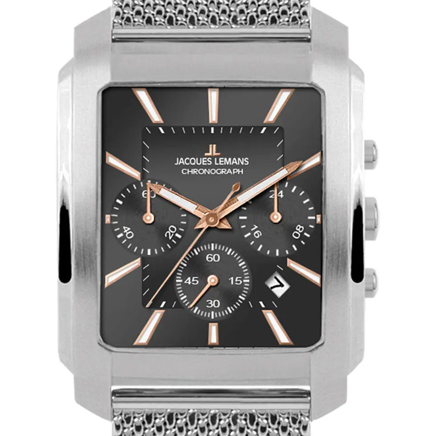 Мужские часы- хронографХронографФункция позволяет измерять отрезки времени с особой точностью: часы, минуты, секунды. Верным признаком хронографа является наличие на циферблате 3 дополнительных окошек-счётчиков. с секундомеромСекундомерСекундоме́р — прибор, способный измерять интервалы времени с точностью до долей секунды. в необычном корпусе прямоугольной формы. Кварцевый механизм с высокой точностью. Минеральное стеклоМинеральное стеклоМинеральное стекло представляет собой искусственно выращенный минерал кварца. Такое стекло отличается особой устойчивостью к повреждениям и царапинам. Уступает по некоторым качествам сапфировому стеклу. устойчивое к появлению царапин, обладающее высокой прозрачностью. Класс водозащиты: 30 метров, позволит защитить корпус от случайных брызг или капель дождя. Корпус часов изготовлен из нержавеющей стали. На циферблате расположены три дополнительных индикатора и окошко даты. Окно даты расположено между 4 и 5 часами. Стрелки и метки с люминесцентным покрытиемЛюминесцентное покрытиеПозволяет считывать показания времени в темноте. Производители наносят на стрелки, часовые индексы, безель или поверхность циферблата светонакопительный состав, дающий холодное свечение.. Стальной браслет миланского плетения с раскладной застёжкойРаскладная застёжкаТакой тип застёжки используется только на браслетах из металла. Она никогда не раскрывается полностью, происходит разделение на 2 и более частей. Раскладывающая застёжка снизит вероятность потери часов к минимуму..