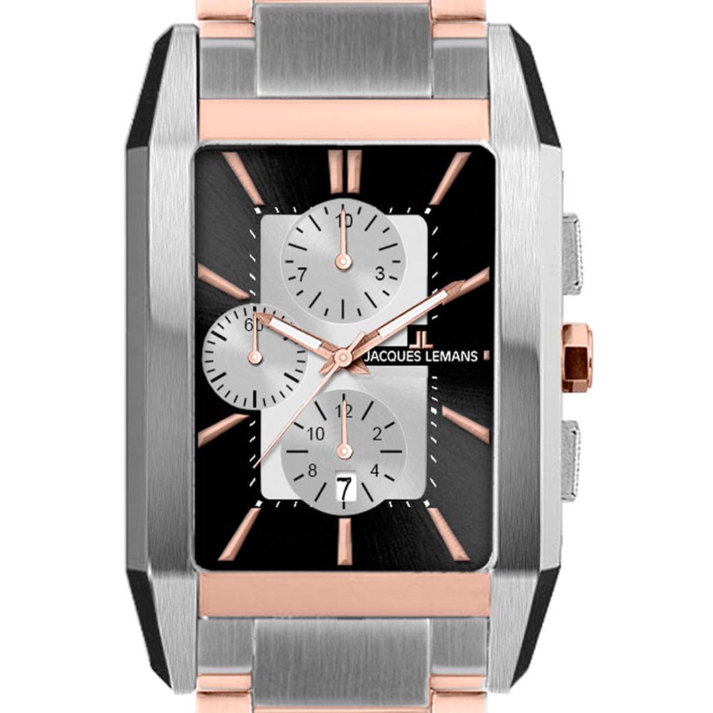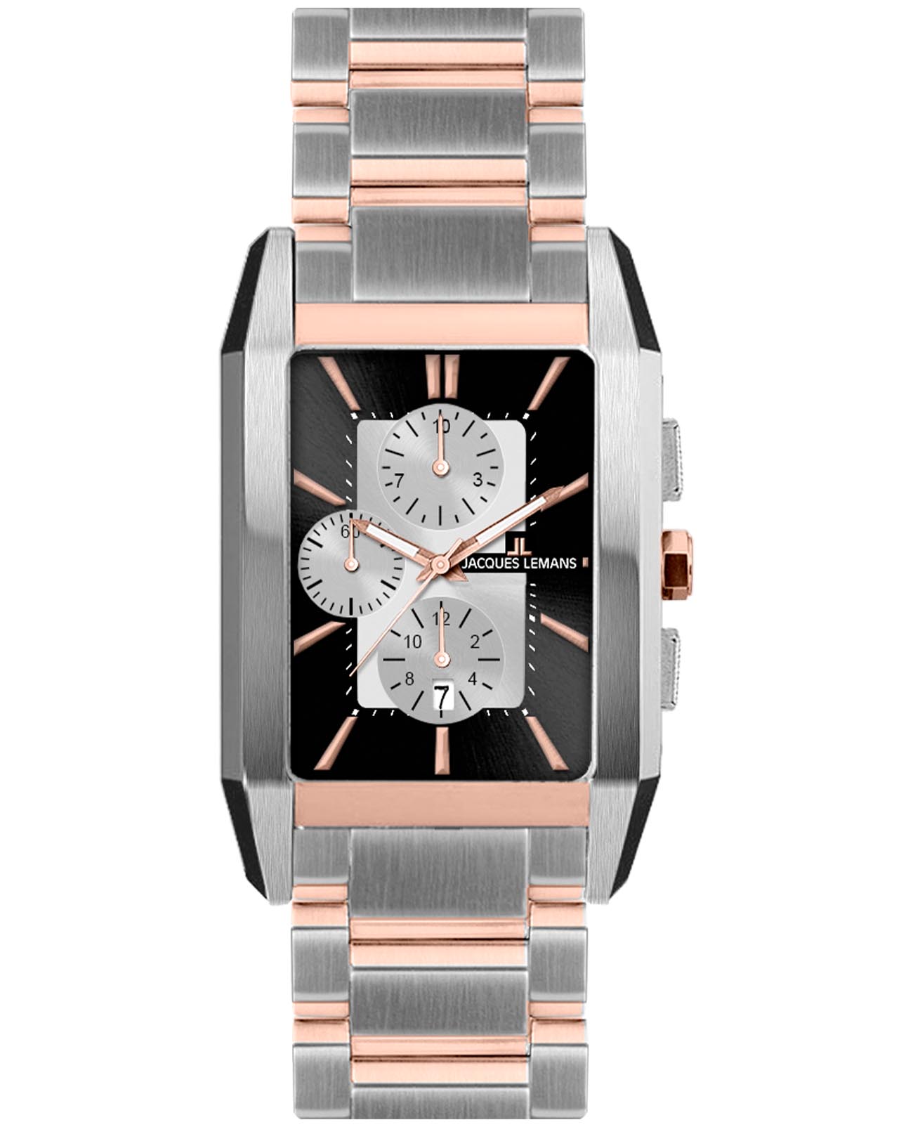 Мужские часы- хронографХронографФункция позволяет измерять отрезки времени с особой точностью: часы, минуты, секунды. Верным признаком хронографа является наличие на циферблате 3 дополнительных окошек-счётчиков. Jacques Lemans Classic 1-2161N, кварцевый механизм с высокой точностью. Минеральное стеклоМинеральное стеклоМинеральное стекло представляет собой искусственно выращенный минерал кварца. Такое стекло отличается особой устойчивостью к повреждениям и царапинам. Уступает по некоторым качествам сапфировому стеклу. устойчивое к мелким механическим повреждениям. Корпус часов изготовлен из стали с частичным PVD-покрытиемPVDУльтратонкое покрытие наносится в технике вакуумного напыления, сочетает в себе нитрид титана особой прочности со слоем золота или оксида хрома. Несёт в себе декоративную или защитную функцию.. Окошко даты находится в положении 6 часов. Стрелки с люминесцентным покрытиемЛюминесцентное покрытиеПозволяет считывать показания времени в темноте. Производители наносят на стрелки, часовые индексы, безель или поверхность циферблата светонакопительный состав, дающий холодное свечение.. Класс водозащиты: 50 метров, позволит плавать, нырять и заниматься другими водными видами спорта. Стальной браслет с частичным PVD-покрытиемPVDУльтратонкое покрытие наносится в технике вакуумного напыления, сочетает в себе нитрид титана особой прочности со слоем золота или оксида хрома. Несёт в себе декоративную или защитную функцию. на раскладной застёжкеРаскладная застёжкаТакой тип застёжки используется только на браслетах из металла. Она никогда не раскрывается полностью, происходит разделение на 2 и более частей. Раскладывающая застёжка снизит вероятность потери часов к минимуму..