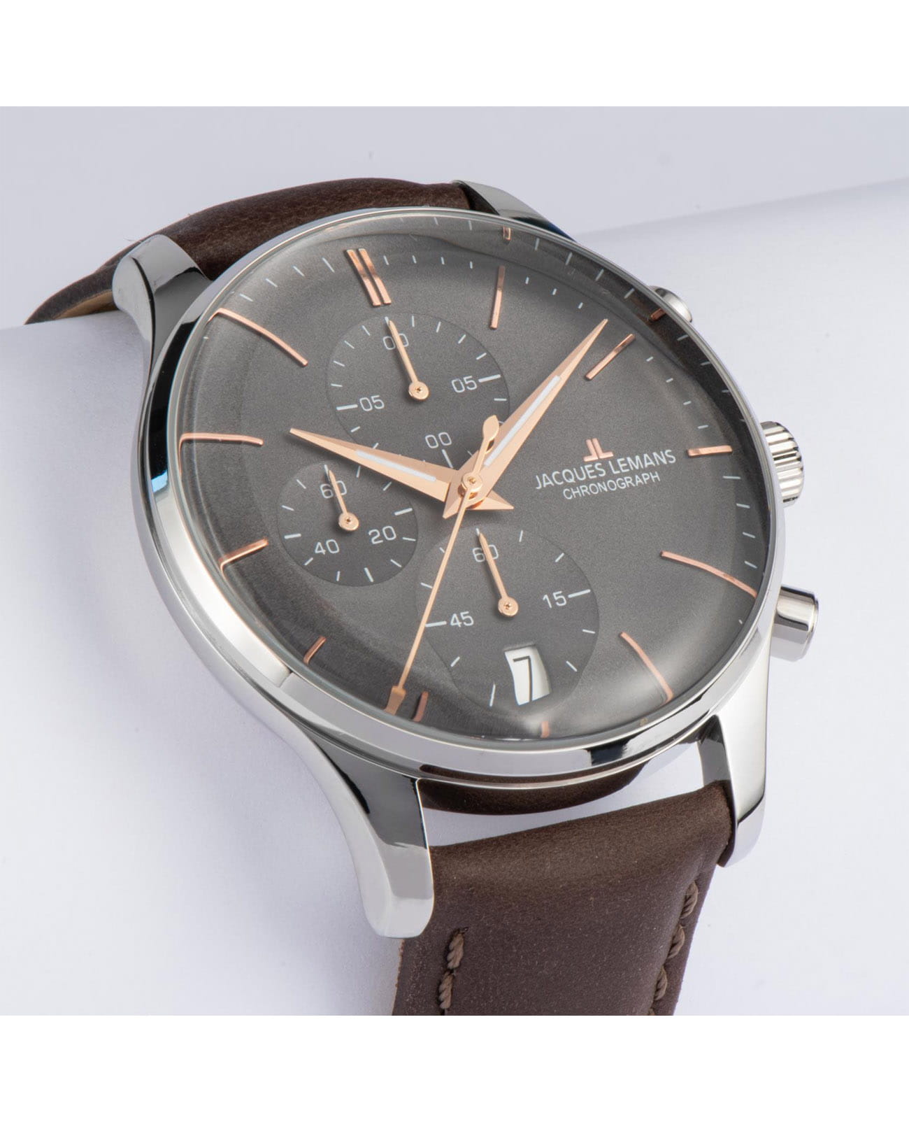 Мужские часы-хронографХронографФункция позволяет измерять отрезки времени с особой точностью: часы, минуты, секунды. Верным признаком хронографа является наличие на циферблате 3 дополнительных окошек-счётчиков. с секундомеромСекундомерСекундоме́р — прибор, способный измерять интервалы времени с точностью до долей секунды. Jacques Lemans Classic 1-2163E, кварцевый механизм с высокой точностью. Минеральное стеклоМинеральное стеклоМинеральное стекло представляет собой искусственно выращенный минерал кварца. Такое стекло отличается особой устойчивостью к повреждениям и царапинам. Уступает по некоторым качествам сапфировому стеклу. устойчивое к мелким механическим повреждениям. Корпус часов изготовлен из стали. Окошко даты находится в положении 6 часов. Стрелки с люминесцентным покрытиемЛюминесцентное покрытиеПозволяет считывать показания времени в темноте. Производители наносят на стрелки, часовые индексы, безель или поверхность циферблата светонакопительный состав, дающий холодное свечение.. Класс водозащиты: 50 метров, позволит плавать, нырять и заниматься другими водными видами спорта. Кожаный ремешок на стандартной застёжке.
