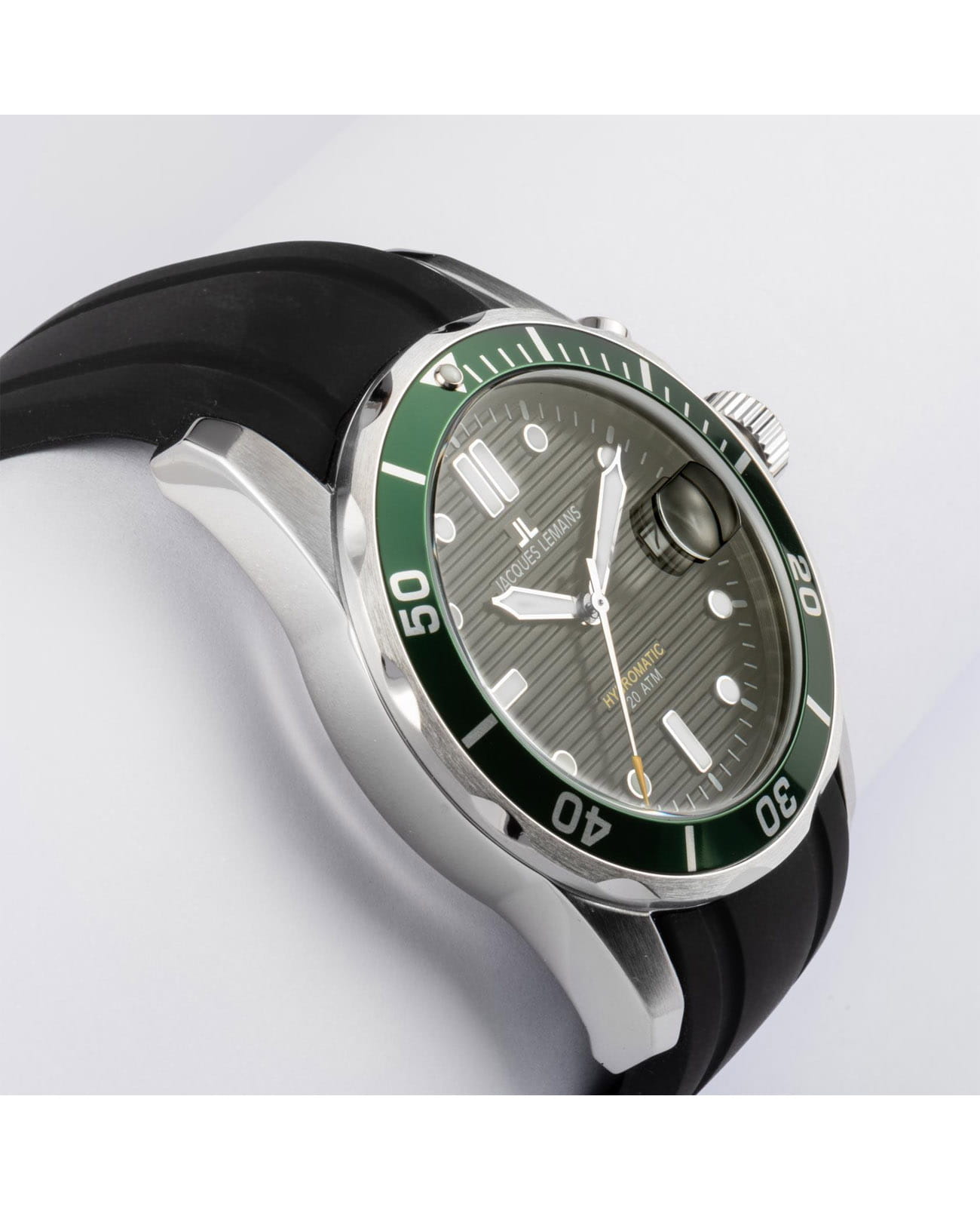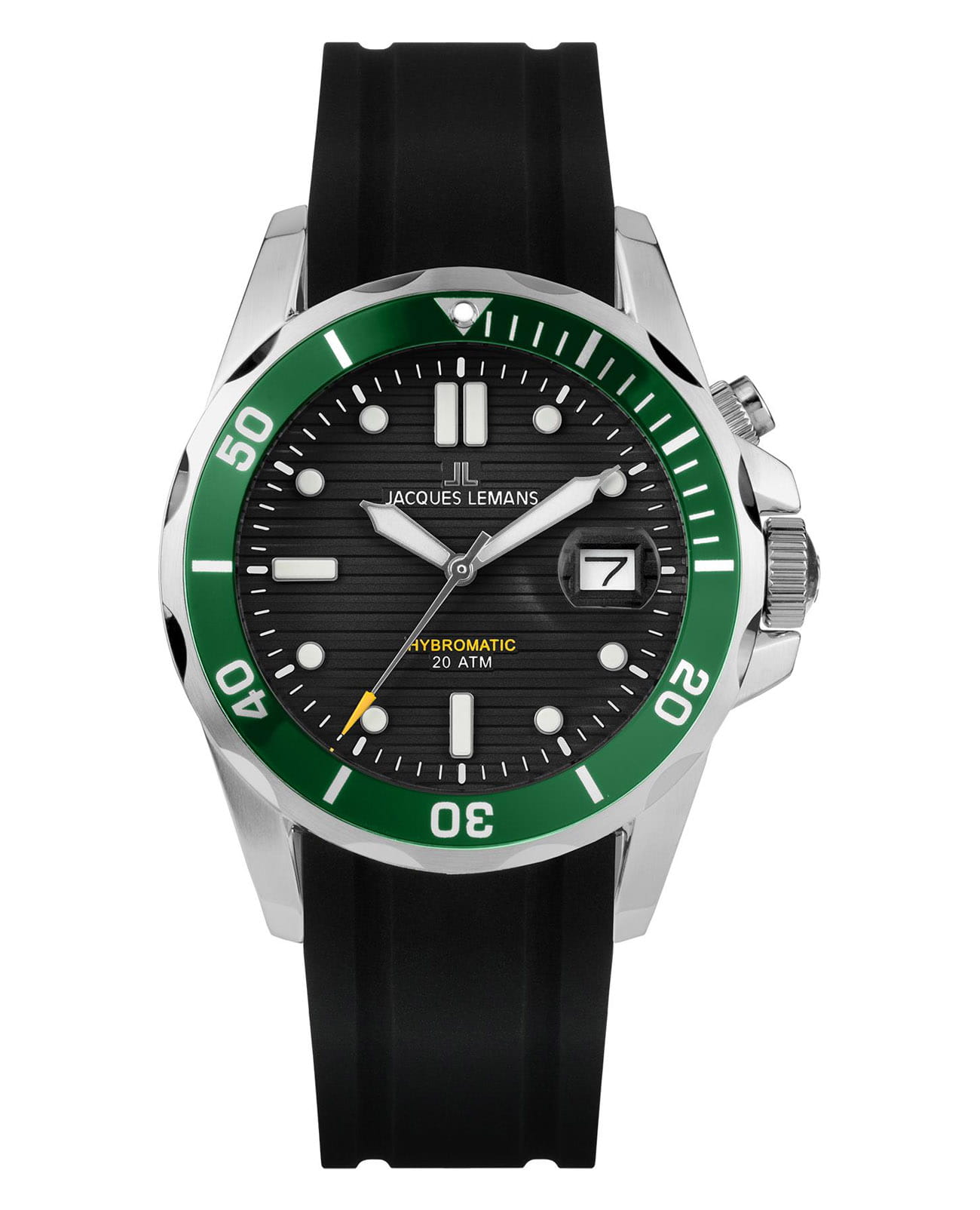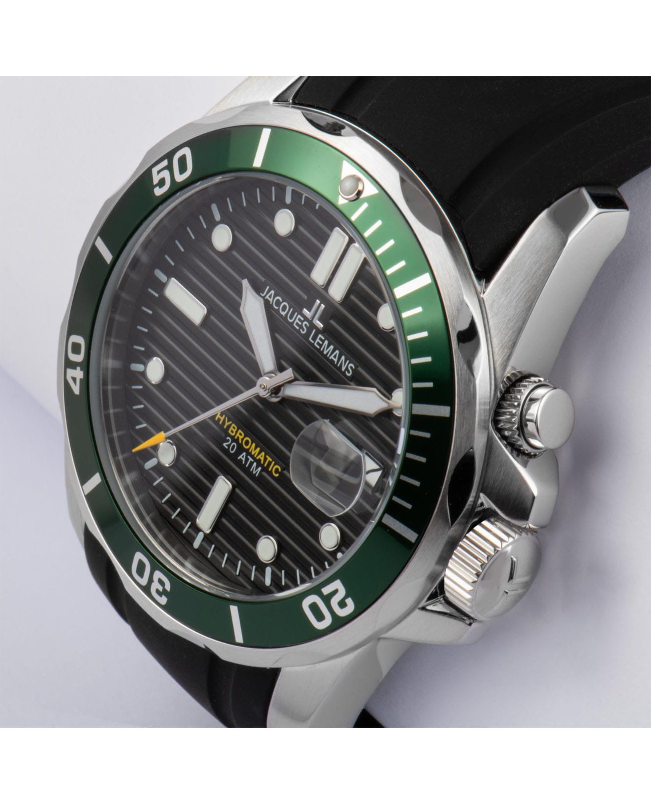 Мужские часы Jacques Lemans Hybromatic 1-2170E с минеральным стекломМинеральное стеклоМинеральное стекло представляет собой искусственно выращенный минерал кварца. Такое стекло отличается особой устойчивостью к повреждениям и царапинам. Уступает по некоторым качествам сапфировому стеклу., гибрид кварца и механики с автоподзаводом. Корпус выполенен из нержавеющей стали. Вращающийся безельБезельВнешний ободок, закрепляющий стекло. В спортивных часах так называется поворотное кольцо с делениями на циферблате, выполняет роль таймера – замеряет отрезки времени на шкале. Неподвижный безель – элемент декора. Однонаправленно вращающийся безель на дайверских часах позволяет фиксировать моменты погружения и выныривания на поверхность. из нержавеющей стали с PVDPVDУльтратонкое покрытие наносится в технике вакуумного напыления, сочетает в себе нитрид титана особой прочности со слоем золота или оксида хрома. Несёт в себе декоративную или защитную функцию. покрытием. Стрелки и метки с люминесцентным покрытиемЛюминесцентное покрытиеПозволяет считывать показания времени в темноте. Производители наносят на стрелки, часовые индексы, безель или поверхность циферблата светонакопительный состав, дающий холодное свечение.. Окошко даты находится в положении 3 часов. Класс водозащиты: 200 метров, позволит плавать, нырять и заниматься другими водными видами спорта. Силиконовый ремешок на стандартной застежке.