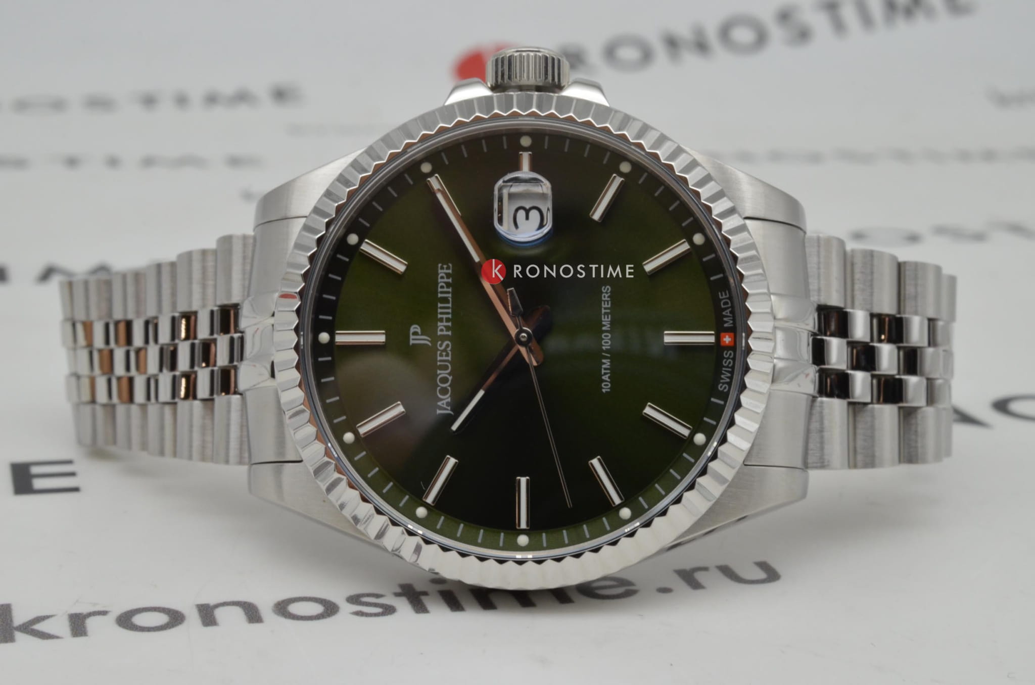 Jacques Philippe JPQGS5913X6V2 — мужские часы в сдержанном классическом исполнении с акцентом на простоту и надёжность. Корпус диаметром 40 мм выполнен из нержавеющей стали, а его умеренная толщина — около 12 мм — делает модель универсальной и комфортной в повседневной носке. Циферблат оформлен в светлом зеленом тоне с тонкими стрелками, лаконичными часовыми метками и аккуратным окошком даты в позиции «3 часа». Минималистичный стиль подчёркивает строгость и чистоту дизайна. Поверхность защищена устойчивым к царапинам сапфировым стекломСапфировое стеклоПрочный и надёжный материал из кристалла сапфира синтетического происхождения, характеризующийся особой твёрдостью и устойчивостью к царапинам и повреждениям., которое обеспечивает хорошую читаемость и долговечность. Механизм — точный швейцарский кварц, не требующий подзавода. Он обеспечивает стабильную и бесперебойную работу часов, сохраняя точность в любых условиях. Браслет из нержавеющей стали визуально продолжает корпус и фиксируется с помощью надёжной застёжки, обеспечивая комфортную посадку. Ширина браслета — 22 мм. Водозащита до 10 ATM позволяет использовать часы не только в повседневной жизни, но и при активности на воде. Jacques Philippe — это надёжная и универсальная модель для тех, кто ценит швейцарскую точность, простоту и уверенный стиль без лишних деталей.