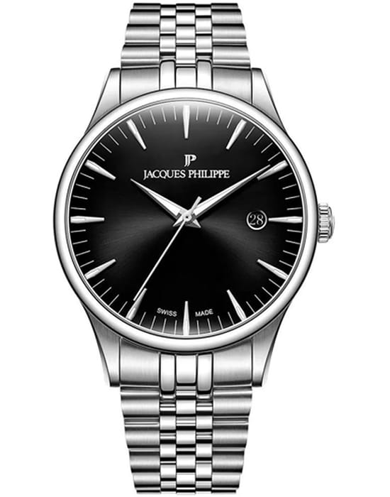 Jacques Philippe JPQGS661316 — стильные мужские часы в классическом формате с акцентом на надёжность и элегантность. Корпус круглой формы диаметром 40 мм из нержавеющей стали отличается утонченным силуэтом при толщине примерно 12 мм, обеспечивая комфорт при длительном ношении . Циферблат чёрного цвета оформлен лаконично: тонкие стрелки и минималистичные часовые метки подчёркивают строгий характер модели. Встроенная функция отображения даты придаёт часы практичность без лишнего визуального нагромождения. Поверхность защищает сапфировое стеклоСапфировое стеклоПрочный и надёжный материал из кристалла сапфира синтетического происхождения, характеризующийся особой твёрдостью и устойчивостью к царапинам и повреждениям. — устойчивое к царапинам и бликам . Внутри используется точный швейцарский кварцевый механизм, не требующий подзавода и сохраняющий стабильную работу без сложного обслуживания . Модель оснащена металлическим браслетом из нержавеющей стали в оттенке металлик‑серый, ширина звеньев около 22 мм, что обеспечивает надёжную посадку и солидный внешний вид . Водозащита составляет до 5 ATM, — часы без проблем выдерживают случайный контакт с водой в повседневной эксплуатации . Jacques Philippe — гармоничное сочетание классического стиля, точного швейцарского кварца и практичности в одном надёжном аксессуаре.