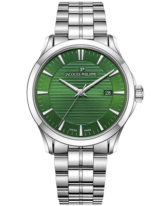 Jacques Philippe JPQGS7913X6 — стильные мужские часы в классическом формате с акцентом на надёжность и элегантность. Корпус круглой формы диаметром 40 мм из нержавеющей стали отличается утонченным силуэтом, обеспечивая комфорт при длительном ношении . Циферблат оформлен лаконично: тонкие стрелки и минималистичные часовые метки с люминесцентным покрытиемЛюминесцентное покрытиеПозволяет считывать показания времени в темноте. Производители наносят на стрелки, часовые индексы, безель или поверхность циферблата светонакопительный состав, дающий холодное свечение. подчёркивают строгий характер модели. Встроенная функция отображения даты придаёт часам практичность без лишнего визуального нагромождения. Поверхность защищает сапфировое стеклоСапфировое стеклоПрочный и надёжный материал из кристалла сапфира синтетического происхождения, характеризующийся особой твёрдостью и устойчивостью к царапинам и повреждениям. — устойчивое к царапинам и бликам. Внутри используется точный швейцарский кварцевый механизм, не требующий подзавода и сохраняющий стабильную работу без сложного обслуживания. Модель оснащена металлическим браслетом из нержавеющей стали в оттенке металлик на застёжке-бабочке с кнопкамиЗастёжка "бабочка"Такой вид застёжки дополняется предохранителями, помогающими избежать случайного раскрытия браслета. Обладают изящным исполнением. , что обеспечивает надёжную посадку и солидный внешний вид . Водозащита составляет до 5 ATM, — часы без проблем выдерживают случайный контакт с водой в повседневной эксплуатации . Jacques Philippe — гармоничное сочетание классического стиля, точного швейцарского кварца и практичности в одном надёжном аксессуаре.