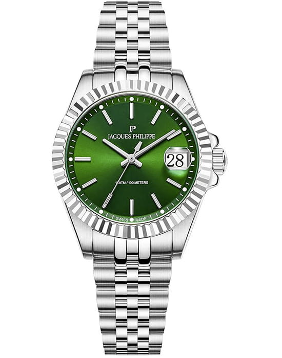 Jacques Philippe JPQLS5813X6 — женские часы в сдержанном классическом исполнении с акцентом на простоту и надёжность. Корпус диаметром 32 мм выполнен из нержавеющей стали — делает модель универсальной и комфортной в повседневной носке. Циферблат оформлен в светлом металлическом тоне с тонкими стрелками, лаконичными часовыми метками с люминесцентным покрытиемЛюминесцентное покрытиеПозволяет считывать показания времени в темноте. Производители наносят на стрелки, часовые индексы, безель или поверхность циферблата светонакопительный состав, дающий холодное свечение. и аккуратным окошком даты в позиции «3 часа». Минималистичный стиль подчёркивает строгость и чистоту дизайна. Поверхность защищена устойчивым к царапинам сапфировым стекломСапфировое стеклоПрочный и надёжный материал из кристалла сапфира синтетического происхождения, характеризующийся особой твёрдостью и устойчивостью к царапинам и повреждениям., которое обеспечивает хорошую читаемость и долговечность. Механизм — точный швейцарский кварц, не требующий подзавода. Он обеспечивает стабильную и бесперебойную работу часов, сохраняя точность в любых условиях. Браслет из нержавеющей стали на застёжке-бабочке с кнопкамиЗастёжка "бабочка"Такой вид застёжки дополняется предохранителями, помогающими избежать случайного раскрытия браслета. Обладают изящным исполнением. визуально продолжает корпус и фиксируется с помощью надёжной застёжки, обеспечивая комфортную посадку. Водозащита до 10 ATM позволяет использовать часы не только в повседневной жизни, но и при активности на воде. Jacques Philippe — это надёжная и универсальная модель для тех, кто ценит швейцарскую точность, простоту и уверенный стиль без лишних деталей.