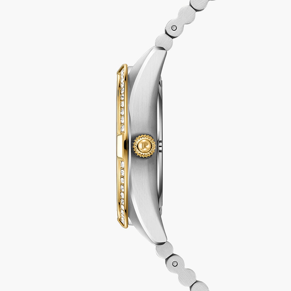 Jacques Philippe Radiante JPQLS687398 — изящная женская модель коллекции Radiante с кварцевым механизмом, сочетающая классический стиль и практичность. Корпус диаметром 33 мм выполнен из нержавеющей стали и полированными поверхностями, безельБезельВнешний ободок, закрепляющий стекло. В спортивных часах так называется поворотное кольцо с делениями на циферблате, выполняет роль таймера – замеряет отрезки времени на шкале. Неподвижный безель – элемент декора. Однонаправленно вращающийся безель на дайверских часах позволяет фиксировать моменты погружения и выныривания на поверхность. с PVDPVDУльтратонкое покрытие наносится в технике вакуумного напыления, сочетает в себе нитрид титана особой прочности со слоем золота или оксида хрома. Несёт в себе декоративную или защитную функцию. инкрустирован кристаллами, что придаёт часам утончённый блеск. Водозащита до 5 атм (50 м) позволяет носить модель в повседневных условиях. Выпуклое сапфировое стеклоСапфировое стеклоПрочный и надёжный материал из кристалла сапфира синтетического происхождения, характеризующийся особой твёрдостью и устойчивостью к царапинам и повреждениям. обеспечивает защиту от царапин и сохраняет высокую прозрачность, делая циферблат легко читаемым. Модель оснащена точным швейцарским кварцевым механизмом с индикацией часов, минут и секунд. Циферблат оформлен в лаконичном стиле с аккуратными метками, а браслет из нержавеющей стали с частичным PVDPVDУльтратонкое покрытие наносится в технике вакуумного напыления, сочетает в себе нитрид титана особой прочности со слоем золота или оксида хрома. Несёт в себе декоративную или защитную функцию.-покрытием гармонично завершает образ, подчёркивая универсальность и элегантность этих часов.