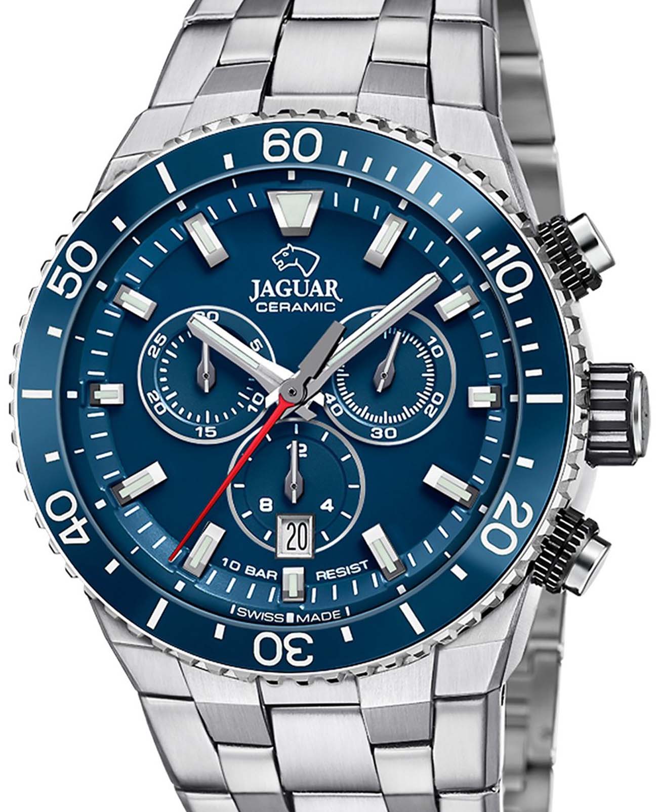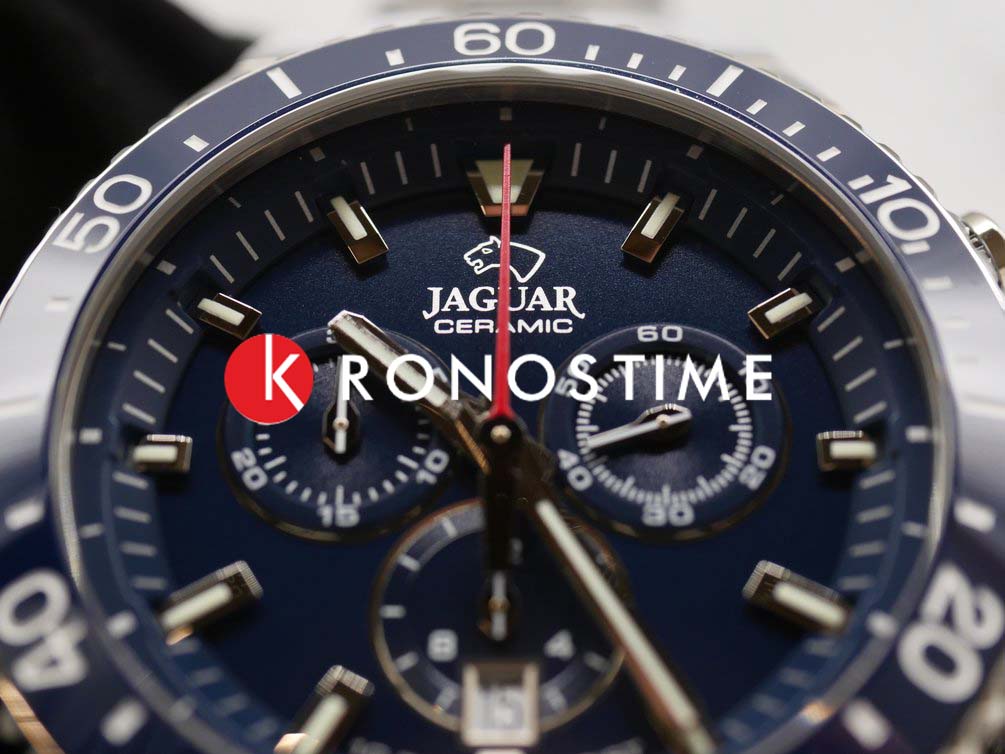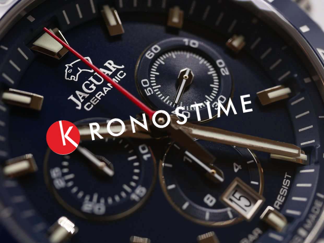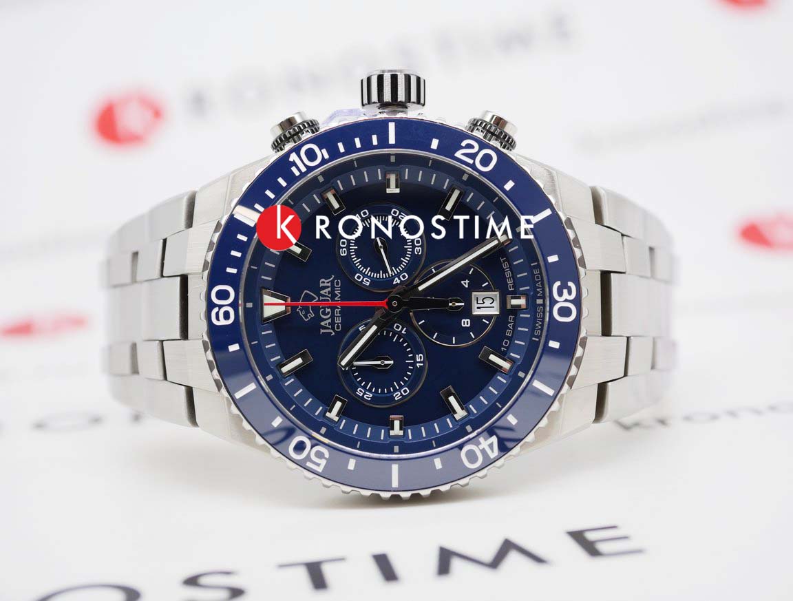 Мужские швейцарские часы-хронографХронографФункция позволяет измерять отрезки времени с особой точностью: часы, минуты, секунды. Верным признаком хронографа является наличие на циферблате 3 дополнительных окошек-счётчиков. Jaguar Ceramic J1022/2. Кварцевый швейцарский калибр Ronda 5030d. Сапфировое стеклоСапфировое стеклоПрочный и надёжный материал из кристалла сапфира синтетического происхождения, характеризующийся особой твёрдостью и устойчивостью к царапинам и повреждениям. устойчивое к мелким механическим повреждениям. Корпус часов изготовлен из нержавеющей стали. Стрелки и метки с люминесцентным покрытиемЛюминесцентное покрытиеПозволяет считывать показания времени в темноте. Производители наносят на стрелки, часовые индексы, безель или поверхность циферблата светонакопительный состав, дающий холодное свечение.. Окошко даты находится в положении 6 часов. Класс водозащиты: 100 метров, позволит плавать, нырять и заниматься другими водными видами спорта. БезельБезельВнешний ободок, закрепляющий стекло. В спортивных часах так называется поворотное кольцо с делениями на циферблате, выполняет роль таймера – замеряет отрезки времени на шкале. Неподвижный безель – элемент декора. Однонаправленно вращающийся безель на дайверских часах позволяет фиксировать моменты погружения и выныривания на поверхность. из высокотехнологичной керамикиВысокотехнологичная керамикаИнновационный запатентованный Rado материал с гладкой или матовой поверхностью. Керамика за счёт кристаллической структуры обладает повышенной устойчивостью от возникновения царапин. Материал способен принимать температуру тела человека, обеспечивая невероятный комфорт при ношении.. Стальной браслет на раскладной застёжкеРаскладная застёжкаТакой тип застёжки используется только на браслетах из металла. Она никогда не раскрывается полностью, происходит разделение на 2 и более частей. Раскладывающая застёжка снизит вероятность потери часов к минимуму..