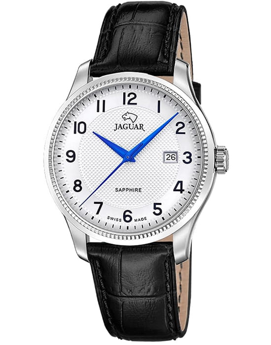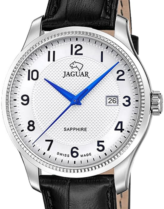 Jaguar J1042/1 из коллекции Acamar — элегантные мужские часы, сочетающие швейцарское качество и современный дизайн. Корпус диаметром 40 мм выполнен из нержавеющей стали, что обеспечивает прочность и долговечность. Сапфировое стеклоСапфировое стеклоПрочный и надёжный материал из кристалла сапфира синтетического происхождения, характеризующийся особой твёрдостью и устойчивостью к царапинам и повреждениям. защищает циферблат от царапин и повреждений. Серебристый циферблат с синими стрелками подчёркивает изысканный стиль. Часы оснащены функцией индикации даты, расположенной в окошке на отметке «3 часа», что добавляет практичности. Ремешок из кожи гарантирует комфортное ношение. Классическая застёжка обеспечивает надёжную фиксацию на запястье. Водозащита до 5 ATM (50 метров) делает часы подходящими для повседневного использования. Jaguar J1042/1 — это идеальный выбор для мужчин, которые ценят классический дизайн и современные технологии.