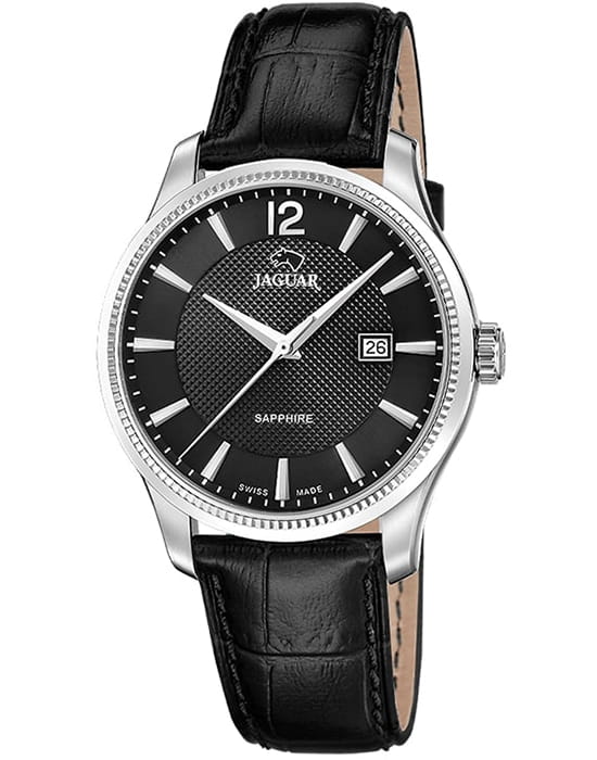 Jaguar J1042/5 из коллекции Acamar — элегантные мужские часы, сочетающие швейцарское качество и современный дизайн. Корпус диаметром 40 мм выполнен из нержавеющей стали, что обеспечивает прочность и долговечность. Сапфировое стеклоСапфировое стеклоПрочный и надёжный материал из кристалла сапфира синтетического происхождения, характеризующийся особой твёрдостью и устойчивостью к царапинам и повреждениям. защищает циферблат от царапин и повреждений. Черный циферблат с серебристыми стрелками подчёркивает изысканный стиль. Часы оснащены функцией индикации даты, расположенной в окошке на отметке «3 часа», что добавляет практичности. Ремешок из кожи гарантирует комфортное ношение. Классическая застёжка обеспечивает надёжную фиксацию на запястье. Водозащита до 5 ATM (50 метров) делает часы подходящими для повседневного использования. Jaguar J1042/5 — это идеальный выбор для мужчин, которые ценят классический дизайн и современные технологии.
