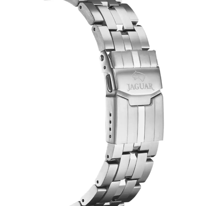 Мужские швейцарские часы-хронографХронографФункция позволяет измерять отрезки времени с особой точностью: часы, минуты, секунды. Верным признаком хронографа является наличие на циферблате 3 дополнительных окошек-счётчиков. Jaguar Executive J852/B. Кварцевый швейцарский калибр Ronda 5030d. Сапфировое стеклоСапфировое стеклоПрочный и надёжный материал из кристалла сапфира синтетического происхождения, характеризующийся особой твёрдостью и устойчивостью к царапинам и повреждениям. устойчивое к мелким механическим повреждениям. Корпус и браслет часов изготовлены из нержавеющей стали. Стрелки и метки с люминесцентным покрытиемЛюминесцентное покрытиеПозволяет считывать показания времени в темноте. Производители наносят на стрелки, часовые индексы, безель или поверхность циферблата светонакопительный состав, дающий холодное свечение.. Окошко даты находится в положении между «4» и «5 часами». Класс водозащиты: 100 метров, позволит плавать, нырять и заниматься другими водными видами спорта. Стальной браслет на раскладной застёжкеРаскладная застёжкаТакой тип застёжки используется только на браслетах из металла. Она никогда не раскрывается полностью, происходит разделение на 2 и более частей. Раскладывающая застёжка снизит вероятность потери часов к минимуму..