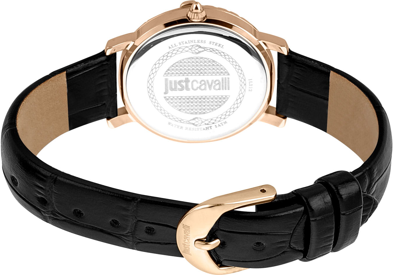 Элегантные женские часы Just Cavalli JC1L212L0035 с минеральным стекломМинеральное стеклоМинеральное стекло представляет собой искусственно выращенный минерал кварца. Такое стекло отличается особой устойчивостью к повреждениям и царапинам. Уступает по некоторым качествам сапфировому стеклу., кварцевый механизм с высокой точностью. Циферблат украшен кристаллами. Корпус часов изготовлен из стали с PVD-покрытиемPVDУльтратонкое покрытие наносится в технике вакуумного напыления, сочетает в себе нитрид титана особой прочности со слоем золота или оксида хрома. Несёт в себе декоративную или защитную функцию.. Класс водозащиты: 30 метров, позволит защитить корпус от случайных брызг или капель дождя. Кожаный ремешок на стандартной застёжке.