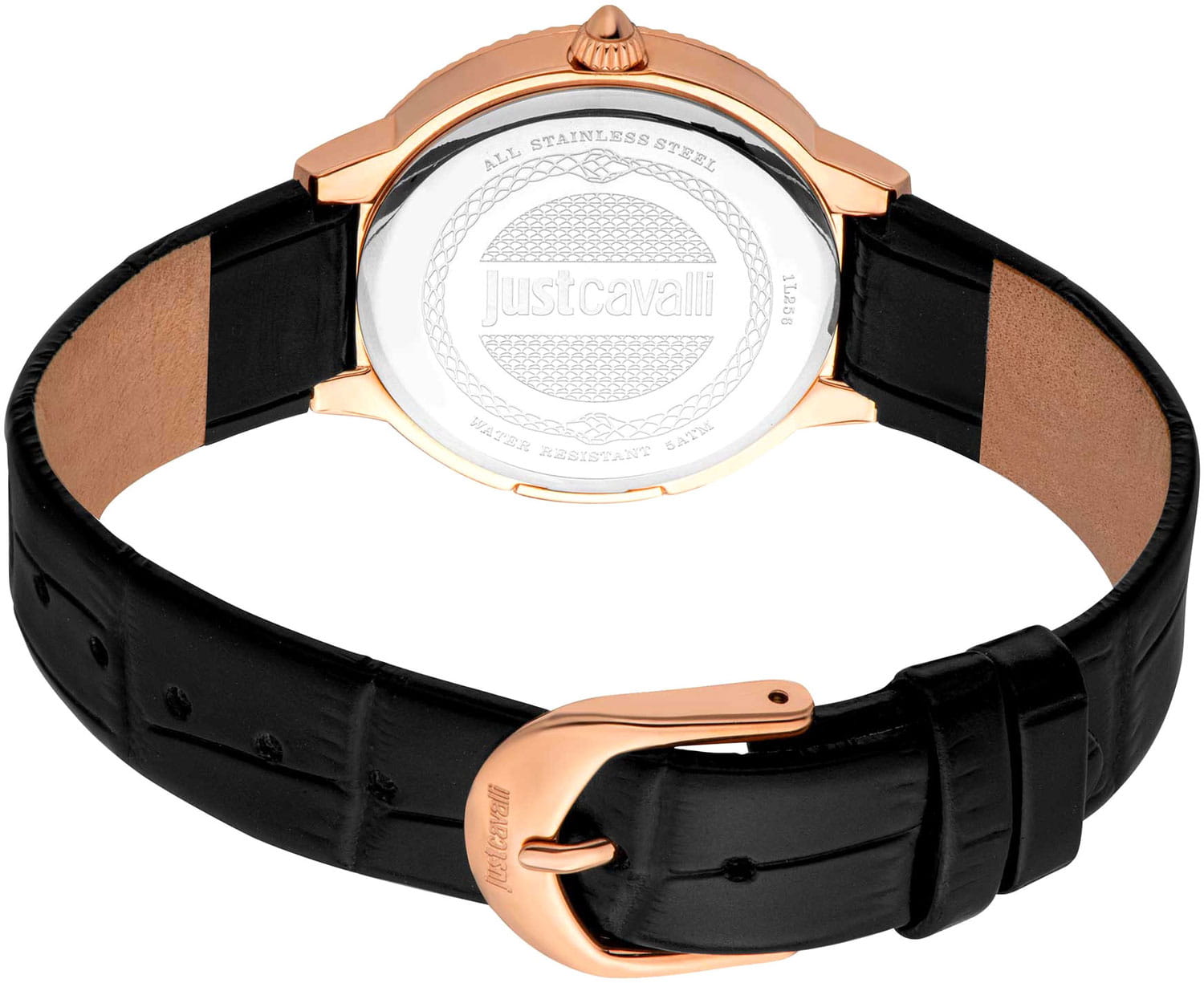 Элегантные женские часы Just Cavalli JC1L256L0035 с минеральным стекломМинеральное стеклоМинеральное стекло представляет собой искусственно выращенный минерал кварца. Такое стекло отличается особой устойчивостью к повреждениям и царапинам. Уступает по некоторым качествам сапфировому стеклу., кварцевый механизм с высокой точностью. Циферблат украшен кристаллами. Корпус часов изготовлен из стали с PVD-покрытиемPVDУльтратонкое покрытие наносится в технике вакуумного напыления, сочетает в себе нитрид титана особой прочности со слоем золота или оксида хрома. Несёт в себе декоративную или защитную функцию.. Класс водозащиты: 50 метров, позволит защитить корпус от случайных брызг или капель дождя. Кожаный ремешок на стандартной застёжке.