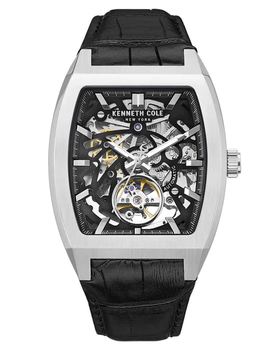 Kenneth Cole KCWGX0077403 — мужская автоматическая модель с выразительным современным стилем и скелетонизированным дизайном. Корпус выполнен из нержавеющей стали, что подчёркивает архитектурный облик часов. Циферблат с открытым механизмом позволяет рассмотреть работу автоматического калибра, акцентируя внимание на его деталях. Метки и стрелки покрыты люминесцентным покрытиемЛюминесцентное покрытиеПозволяет считывать показания времени в темноте. Производители наносят на стрелки, часовые индексы, безель или поверхность циферблата светонакопительный состав, дающий холодное свечение., что обеспечивает читаемость в условиях слабого освещения. Защитную функцию выполняет минеральное стеклоМинеральное стеклоМинеральное стекло представляет собой искусственно выращенный минерал кварца. Такое стекло отличается особой устойчивостью к повреждениям и царапинам. Уступает по некоторым качествам сапфировому стеклу., устойчивое к повседневным повреждениям. Часы дополнены кожаным ремешком с классической застёжкой, создающим удобную посадку и комфорт в носке. Модель объединяет техническую эстетику скелетона и современный характер, подчёркивая индивидуальность владельца.