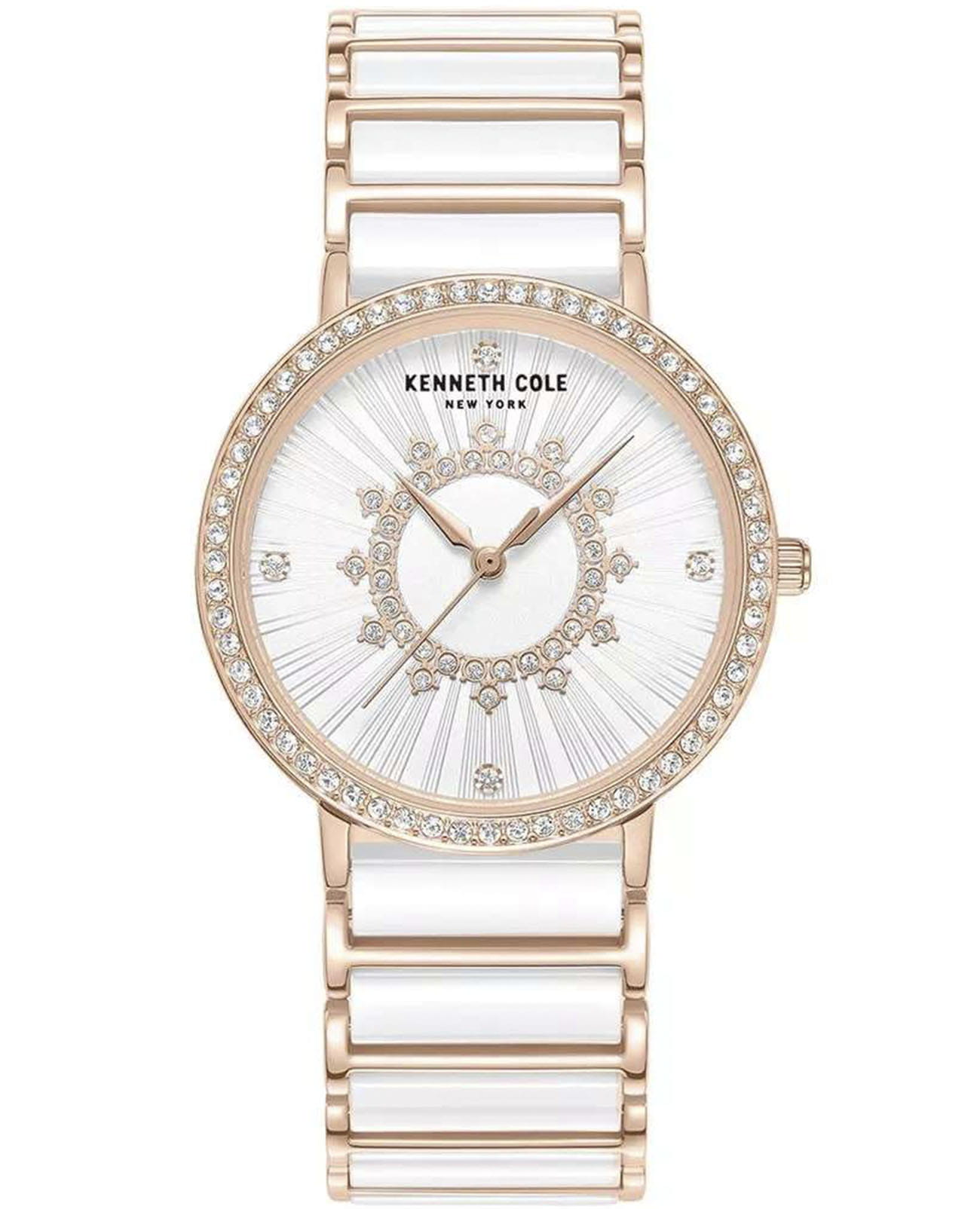 Женские кварцевые часы Kenneth Cole — это элегантный и выразительный аксессуар. Корпус диаметром 36 мм выполнен из нержавеющей стали 316L с IP-покрытиемIP-покрытиеМетод ионного напыления. Демонстрирует повышенную устойчивость к истиранию, окислению и химическим веществам. Под воздействием высокого давления и температуры около 1500°C молекулы металла надёжно соединяются с частицами корпуса часов. цвета розового золота. Циферблат белого цвета оформлен индексами и украшен цирконами. Циферблат защищён минеральным стекломМинеральное стеклоМинеральное стекло представляет собой искусственно выращенный минерал кварца. Такое стекло отличается особой устойчивостью к повреждениям и царапинам. Уступает по некоторым качествам сапфировому стеклу.. Часы оснащены браслетом из нержавеющей стали с IP-покрытиемIP-покрытиеМетод ионного напыления. Демонстрирует повышенную устойчивость к истиранию, окислению и химическим веществам. Под воздействием высокого давления и температуры около 1500°C молекулы металла надёжно соединяются с частицами корпуса часов. и вставками из высокотехнологичной керамикиВысокотехнологичная керамикаИнновационный запатентованный Rado материал с гладкой или матовой поверхностью. Керамика за счёт кристаллической структуры обладает повышенной устойчивостью от возникновения царапин. Материал способен принимать температуру тела человека, обеспечивая невероятный комфорт при ношении. на раскладной застёжкеРаскладная застёжкаТакой тип застёжки используется только на браслетах из металла. Она никогда не раскрывается полностью, происходит разделение на 2 и более частей. Раскладывающая застёжка снизит вероятность потери часов к минимуму.. Водонепроницаемость 30 м позволяет использовать часы в повседневных условиях. Идеальный выбор для тех, кто ценит стиль, блеск и американское качество.