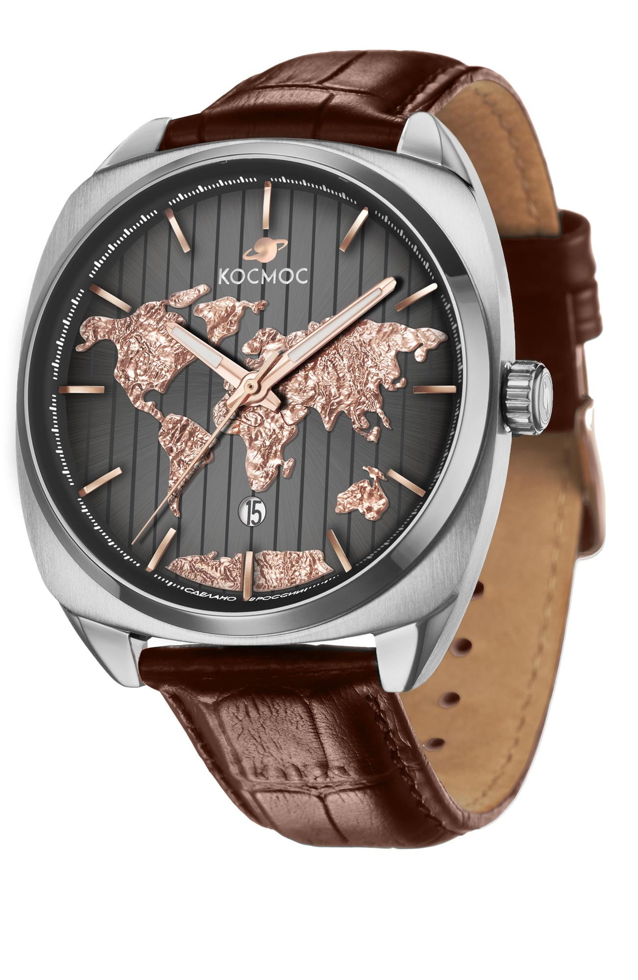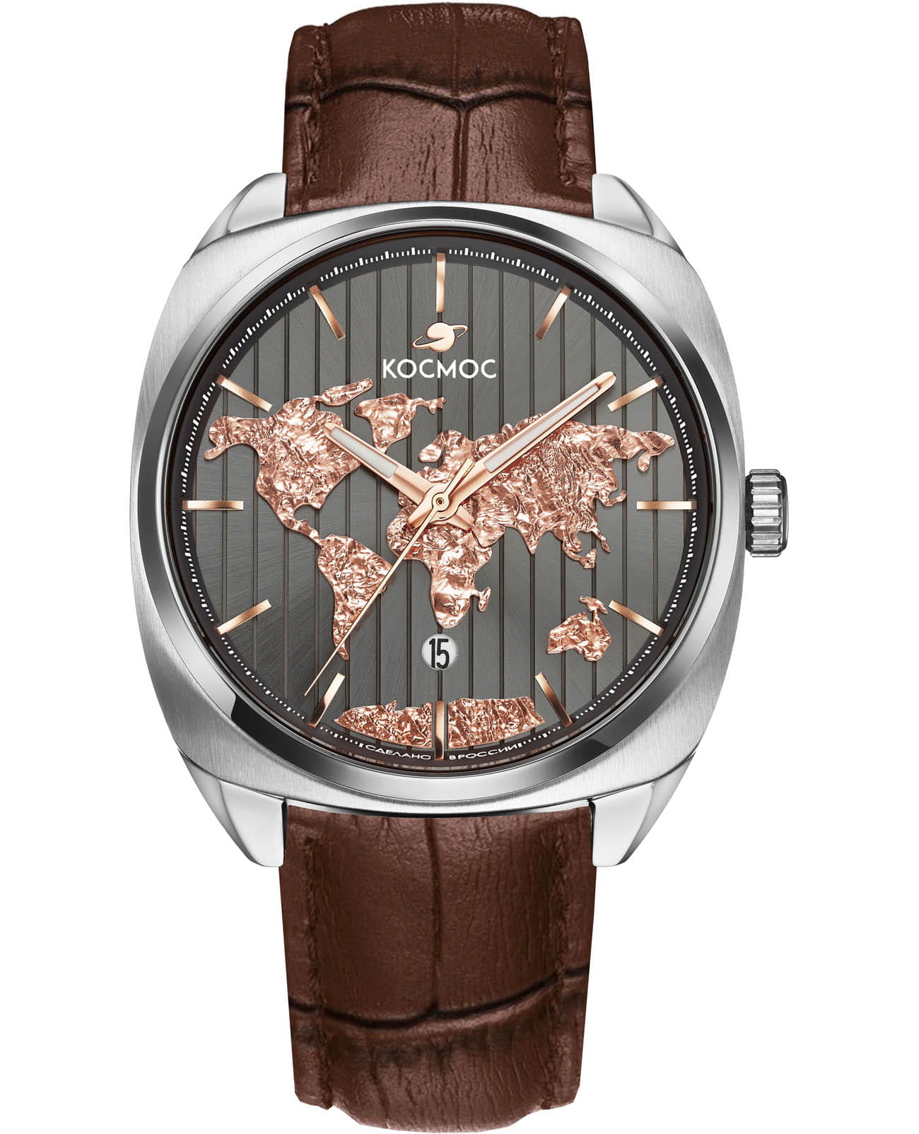 Мужские часы Космос D 113.12.34 из коллекции ЦУП станут идеальным аксессуаром для тех, кто ценит историю и традиции российского часового производства. Механический механизм с автоподзаводом TMI, произведенный японской компанией Seiko, гарантирует высокую точность хода и долговечность работы. Прозрачная задняя крышка, крепящаяся на четырех винтах, позволяет рассмотреть механизм во всех подробностях, включая ротор автоподзавода, украшенный изображением космонавта. Корпус часов выполнен из нержавеющей стали, изображение очертаний континентов защищено прочным минеральным стекломМинеральное стеклоМинеральное стекло представляет собой искусственно выращенный минерал кварца. Такое стекло отличается особой устойчивостью к повреждениям и царапинам. Уступает по некоторым качествам сапфировому стеклу., устойчивым к царапинам. Окошко даты расположено в положении 6 часа, а стрелки имеют люминесцентное покрытиеЛюминесцентное покрытиеПозволяет считывать показания времени в темноте. Производители наносят на стрелки, часовые индексы, безель или поверхность циферблата светонакопительный состав, дающий холодное свечение., что позволяет определять время даже в темноте. Ремешок изготовлен из натуральной кожи коричневого цвета с классической застежкой, обеспечивая комфорт при ношении Часы обладают водозащитой до 10 атм (WR100), что позволит использовать их при плавании и других водных видах спорта.