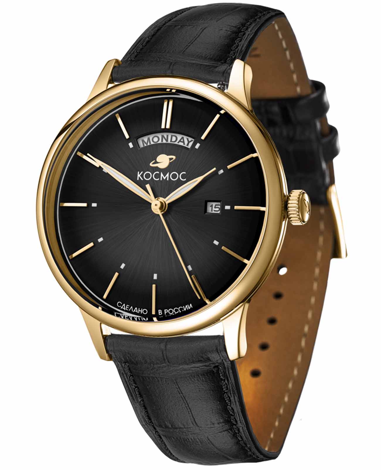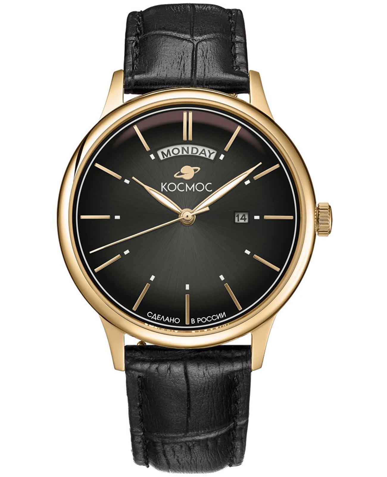 Российские кварцевые часы Космос K011.21.31 с механизмом калибра Miyota оснащены круглым корпусом из стали с PVD-покрытиемPVDУльтратонкое покрытие наносится в технике вакуумного напыления, сочетает в себе нитрид титана особой прочности со слоем золота или оксида хрома. Несёт в себе декоративную или защитную функцию. диаметром 41 мм и защищены минеральным стекломМинеральное стеклоМинеральное стекло представляет собой искусственно выращенный минерал кварца. Такое стекло отличается особой устойчивостью к повреждениям и царапинам. Уступает по некоторым качествам сапфировому стеклу. повышенной прочности. Черный циферблат дополнен функциями отображения числа и дня недели, а стрелки с люминесцентным покрытиемЛюминесцентное покрытиеПозволяет считывать показания времени в темноте. Производители наносят на стрелки, часовые индексы, безель или поверхность циферблата светонакопительный состав, дающий холодное свечение. обеспечивают хорошую видимость в темное время суток. Часы имеют класс водозащиты 50 метров, позволит защитить корпус от случайных брызг или капель дождя. Модель комплектуется ремешком из натуральной кожи на стандартной застежке. Простой и элегантный дизайн делает эти часы универсальным аксессуаром для ценителей комфорта и практичности. Надежный кварцевый механизм обеспечивает точность хода и долговечность модели.