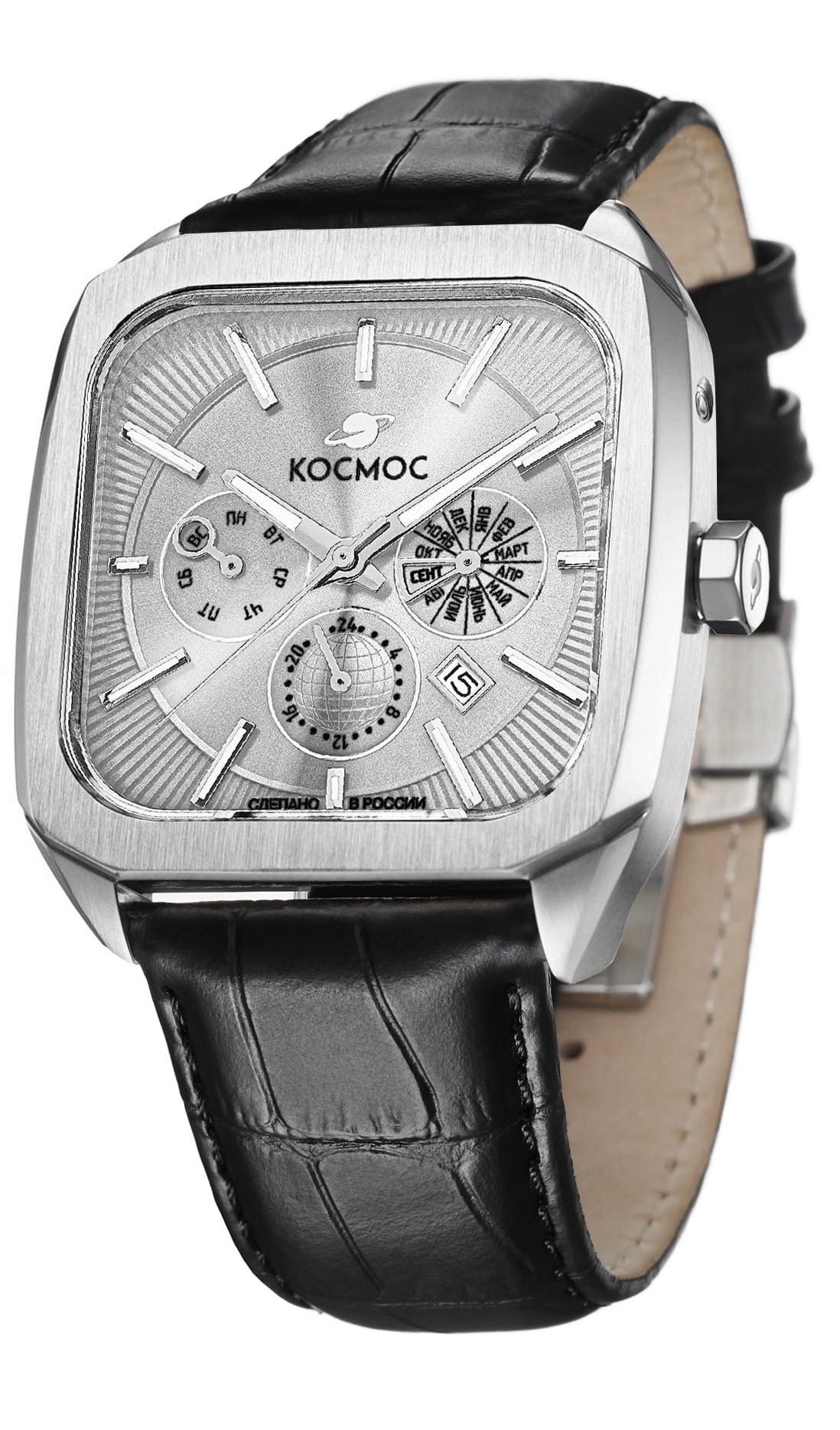 Мужские наручные часы Космос Марсоход II K 219.11.33 — это уникальная лимитированная серия, посвященная аппарату, способному передвигаться по поверхности Красной планеты. Марсоход ассоциируется с брутальностью, мастерством и технической сложностью. Наша страна дважды запускала подобные аппараты еще в 70-х годах прошлого века. Дизайн часов серии Марсоход вдохновлен лучшими работами советских мастеров, сочетая современные технологии часового искусства с обаянием стиля ретро. Корпус в форме квадрата с закругленными углами выполнен из нержавеющей стали украшенной зеркальной полировкой и сатинированием. Удобная заводная головка имеет форму гайки, что добавляет модели индустриальный шарм. Задняя крышка прозрачная, закрепленная на четырех винтах, и позволяет увидеть работу механизма TMI с подвижным ротором, на котором гравируется надпись «Сделано в России». Также здесь представлена гравировка с изображением космонавта, придающая часам особую значимость. Водостойкость достигает 10 атм (WR100), что позволяет использовать часы при плавании и других водных видах спорта. На задней крышке указан индивидуальный номер модели в формате от 01/50 до 50/50. Объемный циферблат состоит из двух уровней. В центре движутся три стрелки, часовая и минутная из которых имеют люминесцентное покрытиеЛюминесцентное покрытиеПозволяет считывать показания времени в темноте. Производители наносят на стрелки, часовые индексы, безель или поверхность циферблата светонакопительный состав, дающий холодное свечение., позволяющее определять время даже в темноте. Также, здесь расположили три дополнительных индикатора: день недели, месяц и время в формате 24-х часов. Для обозначения дня недели и месяца используется кириллица. Окошко даты между 4 и 5 часами выделено накладной рамкой. Циферблат защищен прочным сапфировым стеклом с антибликовым покрытиемСапфировое стеклоПрочный и надёжный материал из кристалла сапфира синтетического происхождения, характеризующийся особой твёрдостью и устойчивостью к царапинам и повреждениям., обеспечивающим отличную читаемость показаний в любых условиях. Второй уровень декорирован гильоше в виде солнечных лучей, на нем закреплены накладные индексы. Браслет изготовлен из натуральной кожи черного цвета и оснащен удобной застёжкой «бабочка» с кнопкамиЗастёжка "бабочка"Такой вид застёжки дополняется предохранителями, помогающими избежать случайного раскрытия браслета. Обладают изящным исполнением. , которая сводит к минимуму вероятность потери. Заводная головка, застежка и браслет украшены фирменным логотипом бренда. Коллекция Марсоход — идеальный выбор для ценителей истории космических достижений и современных технологий.