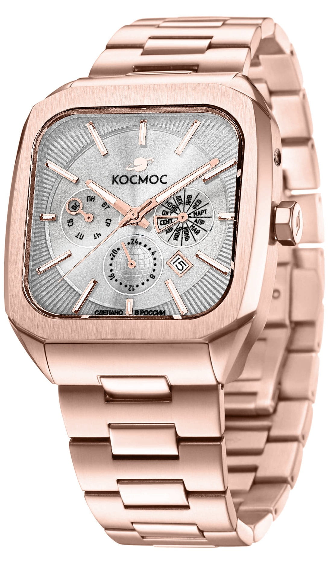 Мужские наручные часы Космос Марсоход II K 219.40.33 — это уникальная лимитированная серия, посвященная аппарату, способному передвигаться по поверхности Красной планеты. Марсоход ассоциируется с брутальностью, мастерством и технической сложностью. Наша страна дважды запускала подобные аппараты еще в 70-х годах прошлого века. Дизайн часов серии Марсоход вдохновлен лучшими работами советских мастеров, сочетая современные технологии часового искусства с обаянием стиля ретро. Корпус в форме квадрата с закругленными углами выполнен из нержавеющей стали с PVDPVDУльтратонкое покрытие наносится в технике вакуумного напыления, сочетает в себе нитрид титана особой прочности со слоем золота или оксида хрома. Несёт в себе декоративную или защитную функцию. покрытием украшен зеркальной полировкой и сатинированием. Удобная заводная головка имеет форму гайки, что добавляет модели индустриальный шарм. Задняя крышка прозрачная, закрепленная на четырех винтах, и позволяет увидеть работу механизма TMI с подвижным ротором, на котором гравируется надпись «Сделано в России». Также здесь представлена гравировка с изображением космонавта, придающая часам особую значимость. Водостойкость достигает 10 атм (WR100), что позволяет использовать часы при плавании и других водных видах спорта. На задней крышке указан индивидуальный номер модели в формате от 01/50 до 50/50. Объемный циферблат состоит из двух уровней. В центре движутся три стрелки, часовая и минутная из которых имеют люминесцентное покрытиеЛюминесцентное покрытиеПозволяет считывать показания времени в темноте. Производители наносят на стрелки, часовые индексы, безель или поверхность циферблата светонакопительный состав, дающий холодное свечение., позволяющее определять время даже в темноте. Также, здесь расположили три дополнительных индикатора: день недели, месяц и время в формате 24-х часов. Для обозначения дня недели и месяца используется кириллица. Окошко даты между 4 и 5 часами выделено накладной рамкой. Циферблат защищен прочным сапфировым стеклом с антибликовым покрытиемСапфировое стеклоПрочный и надёжный материал из кристалла сапфира синтетического происхождения, характеризующийся особой твёрдостью и устойчивостью к царапинам и повреждениям., обеспечивающим отличную читаемость показаний в любых условиях. Второй уровень декорирован гильоше в виде солнечных лучей, на нем закреплены накладные индексы. Браслет изготовлен из литых стальных звеньев нержавеющей стали и оснащен удобной застёжкой «бабочка» с кнопкамиЗастёжка "бабочка"Такой вид застёжки дополняется предохранителями, помогающими избежать случайного раскрытия браслета. Обладают изящным исполнением. , которая сводит к минимуму вероятность потери. Заводная головка, застежка и браслет украшены фирменным логотипом бренда. Коллекция Марсоход — идеальный выбор для ценителей истории космических достижений и современных технологий.
