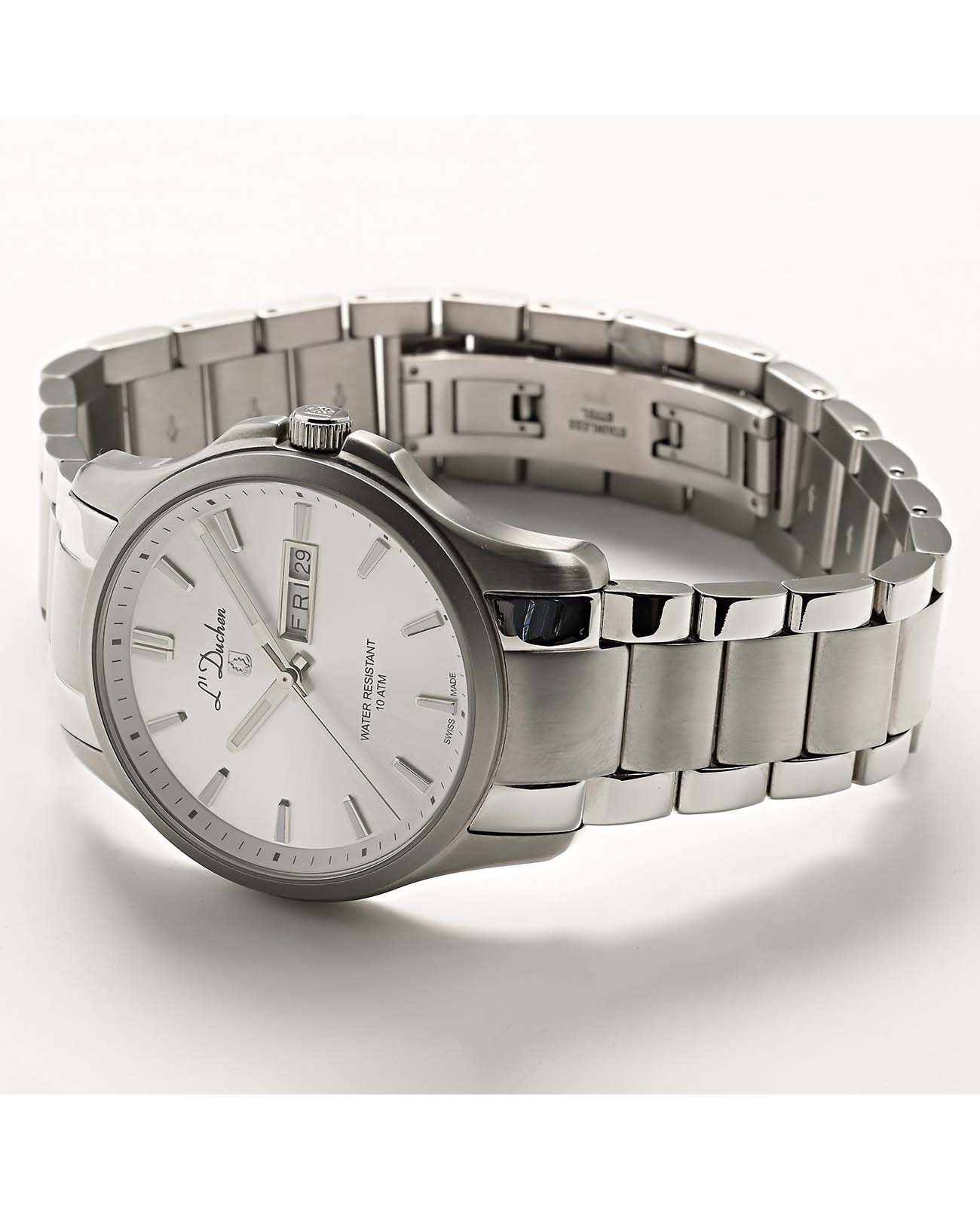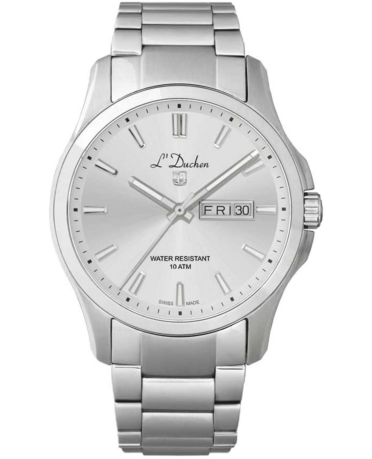 Мужские швейцарские часы L'Duchen Dynamique D 261.10.33, кварцевый механизм с высокой точностью. Сапфировое стеклоСапфировое стеклоПрочный и надёжный материал из кристалла сапфира синтетического происхождения, характеризующийся особой твёрдостью и устойчивостью к царапинам и повреждениям. устойчивое к появлению царапин, обладающее высокой прозрачностью. Корпус часов выполнен из нержавеющей стали. Стрелки с люминесцентным покрытиемЛюминесцентное покрытиеПозволяет считывать показания времени в темноте. Производители наносят на стрелки, часовые индексы, безель или поверхность циферблата светонакопительный состав, дающий холодное свечение.. Класс водозащиты: 100 метров, позволит плавать, нырять и заниматься другими водными видами спорта. Стальной браслет на застёжке «бабочка» с кнопкамиЗастёжка "бабочка"Такой вид застёжки дополняется предохранителями, помогающими избежать случайного раскрытия браслета. Обладают изящным исполнением. .