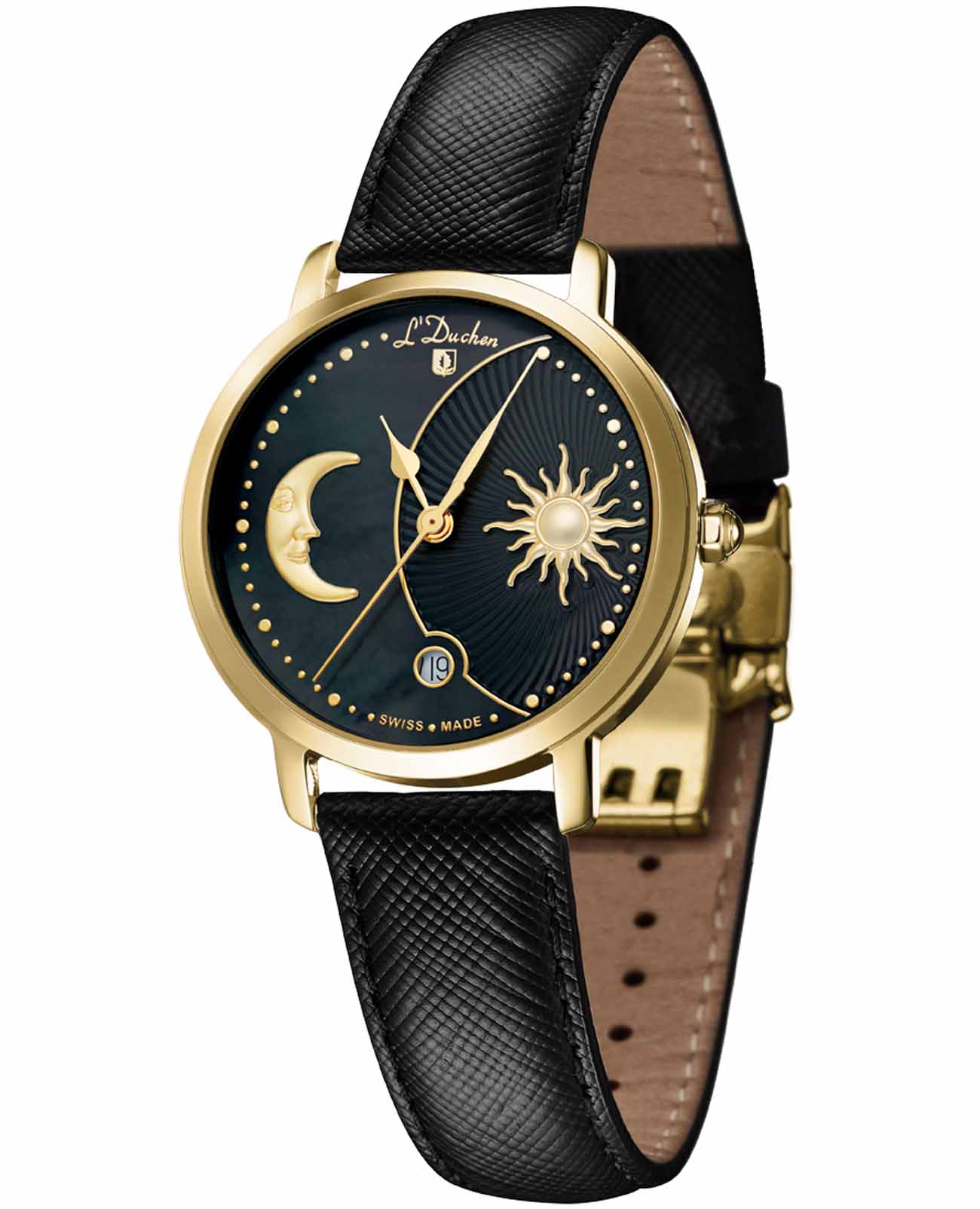 Женские швейцарские часы L'Duchen Day & Night D 781.21.31, кварцевый механизм с высокой точностью. Сапфировое стеклоСапфировое стеклоПрочный и надёжный материал из кристалла сапфира синтетического происхождения, характеризующийся особой твёрдостью и устойчивостью к царапинам и повреждениям. устойчивое к появлению царапин, обладающее высокой прозрачностью. Корпус часов выполнен из нержавеющей стали с PVD-покрытиемPVDУльтратонкое покрытие наносится в технике вакуумного напыления, сочетает в себе нитрид титана особой прочности со слоем золота или оксида хрома. Несёт в себе декоративную или защитную функцию.. Окошко даты находится в положении 6 часов. Класс водозащиты: 50 метров, позволит защитить корпус от случайных брызг или капель дождя. Кожаный ремешок на застёжке «бабочка» с кнопкамиЗастёжка "бабочка"Такой вид застёжки дополняется предохранителями, помогающими избежать случайного раскрытия браслета. Обладают изящным исполнением. .