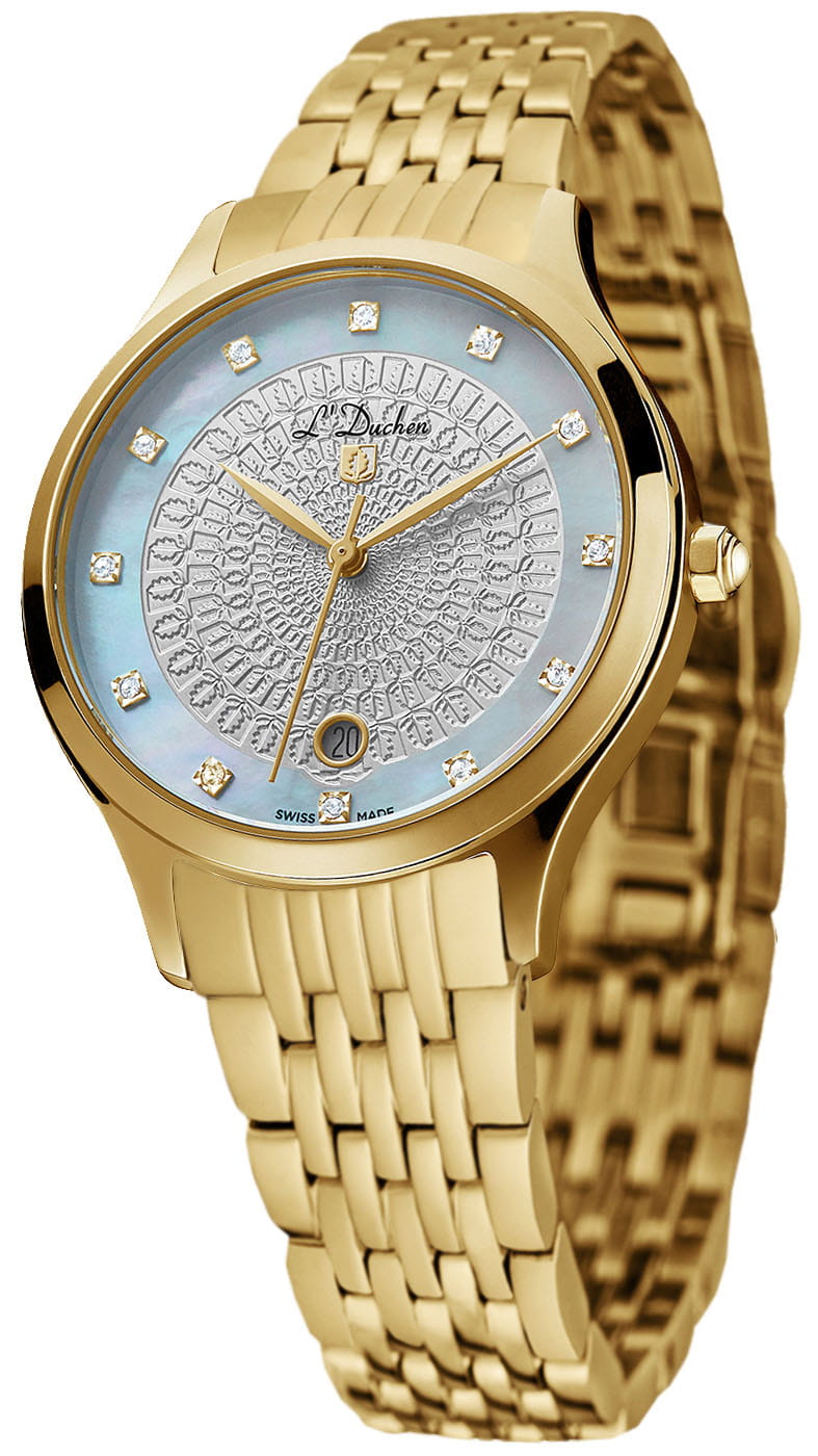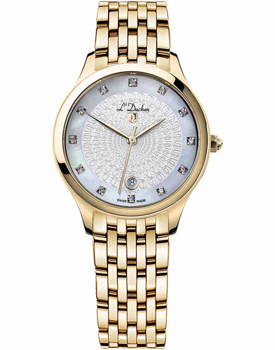 Женские швейцарские часы L'Duchen Grace D 791.20.33, кварцевый механизм с высокой точностью. Сапфировое стеклоСапфировое стеклоПрочный и надёжный материал из кристалла сапфира синтетического происхождения, характеризующийся особой твёрдостью и устойчивостью к царапинам и повреждениям. устойчивое к появлению царапин, обладающее высокой прозрачностью. Корпус часов выполнен из нержавеющей стали с PVD-покрытиемPVDУльтратонкое покрытие наносится в технике вакуумного напыления, сочетает в себе нитрид титана особой прочности со слоем золота или оксида хрома. Несёт в себе декоративную или защитную функцию.. Окошко даты находится в положении 6 часов. Класс водозащиты: 50 метров, позволит защитить корпус от случайных брызг или капель дождя. Стальной браслет с PVD-покрытиемPVDУльтратонкое покрытие наносится в технике вакуумного напыления, сочетает в себе нитрид титана особой прочности со слоем золота или оксида хрома. Несёт в себе декоративную или защитную функцию. на застёжке «бабочка» с кнопкамиЗастёжка "бабочка"Такой вид застёжки дополняется предохранителями, помогающими избежать случайного раскрытия браслета. Обладают изящным исполнением. .