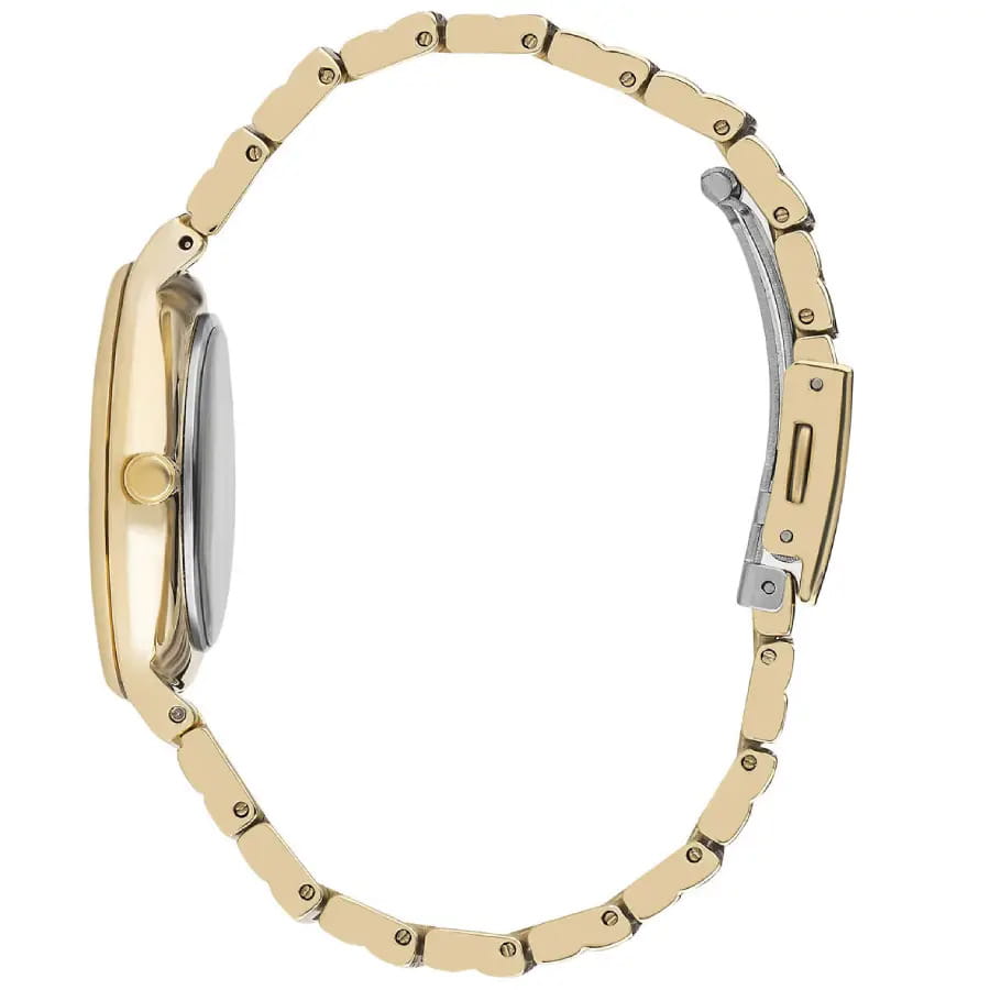 Женские наручные часы Lee Cooper LC07342.120 — это элегантная модель с утончённым дизайном. Корпус диаметром 35 мм выполнен из нержавеющей стали с IP-покрытиемIP-покрытиеМетод ионного напыления. Демонстрирует повышенную устойчивость к истиранию, окислению и химическим веществам. Под воздействием высокого давления и температуры около 1500°C молекулы металла надёжно соединяются с частицами корпуса часов., что придаёт часам изысканный вид. Перламутровый циферблат украшен изящными метками и стрелками, обеспечивая удобное считывание времени. Циферблат защищён минеральным стекломМинеральное стеклоМинеральное стекло представляет собой искусственно выращенный минерал кварца. Такое стекло отличается особой устойчивостью к повреждениям и царапинам. Уступает по некоторым качествам сапфировому стеклу., устойчивым к царапинам. Часы работают на кварцевом механизме, обеспечивая точность хода. Браслет из нержавеющей стали с раскладной застёжкойРаскладная застёжкаТакой тип застёжки используется только на браслетах из металла. Она никогда не раскрывается полностью, происходит разделение на 2 и более частей. Раскладывающая застёжка снизит вероятность потери часов к минимуму. гарантирует комфортное ношение и надёжную фиксацию на запястье. Водозащита 30 метров защищает часы от случайных брызг и дождя, делая их подходящими для повседневного использования.