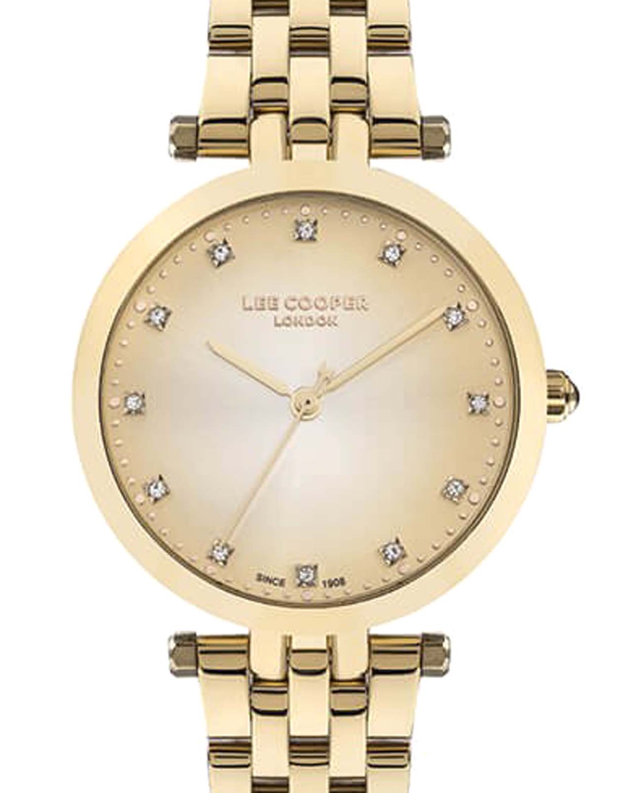Женские наручные часы Lee Cooper LC07411.110 — это элегантная модель с утончённым дизайном. Корпус диаметром 34 мм выполнен из суперметалла с IP-покрытиемIP-покрытиеМетод ионного напыления. Демонстрирует повышенную устойчивость к истиранию, окислению и химическим веществам. Под воздействием высокого давления и температуры около 1500°C молекулы металла надёжно соединяются с частицами корпуса часов., что придаёт часам изысканный вид. Золотистый циферблат украшен изящными вставками из кристаллов и стрелками, обеспечивая удобное считывание времени. Циферблат защищён минеральным стекломМинеральное стеклоМинеральное стекло представляет собой искусственно выращенный минерал кварца. Такое стекло отличается особой устойчивостью к повреждениям и царапинам. Уступает по некоторым качествам сапфировому стеклу., устойчивым к царапинам. Часы работают на кварцевом механизме, обеспечивая точность хода. Браслет из нержавеющей стали с раскладной застёжкойРаскладная застёжкаТакой тип застёжки используется только на браслетах из металла. Она никогда не раскрывается полностью, происходит разделение на 2 и более частей. Раскладывающая застёжка снизит вероятность потери часов к минимуму. гарантирует комфортное ношение и надёжную фиксацию на запястье. Водозащита 30 метров защищает часы от случайных брызг и дождя, делая их подходящими для повседневного использования.