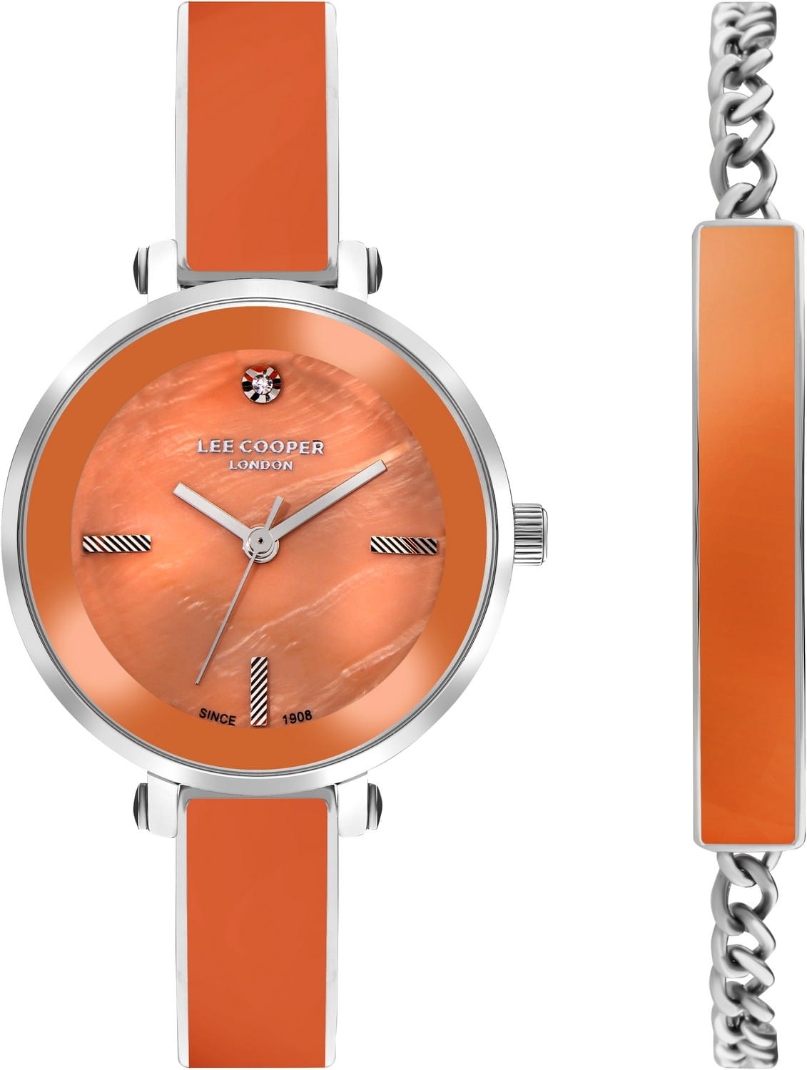 Женские часы Lee Cooper LC07813.380 выполнены в классическом стиле и сочетают строгий дизайн с надёжным механизмом. Модель оснащена кварцевым механизмом, обеспечивающим точность хода и минимальное обслуживание. Корпус круглой формы имеет размер 32 мм, изготовлен из суперметалла, гарантирует комфорт при ношении. Циферблат оранжевого цвета дополнен индексами для чёткого отсчёта времени. Защиту циферблата обеспечивает минеральное стеклоМинеральное стеклоМинеральное стекло представляет собой искусственно выращенный минерал кварца. Такое стекло отличается особой устойчивостью к повреждениям и царапинам. Уступает по некоторым качествам сапфировому стеклу., устойчивое к мелким механическим повреждениям. Изысканный стальной браслет с керамическими вставками на раскладной застёжкеРаскладная застёжкаТакой тип застёжки используется только на браслетах из металла. Она никогда не раскрывается полностью, происходит разделение на 2 и более частей. Раскладывающая застёжка снизит вероятность потери часов к минимуму. гарантирует комфортную посадку на запястье. Водозащита 3 АТМ позволяет использовать часы в повседневных условиях без риска повреждения от случайных брызг воды. В комплекте к часам идет дополнительный браслет в цвет часов. Это сочетание классического дизайна, прочности материалов и качества исполнения для уверенных в себе женщин.