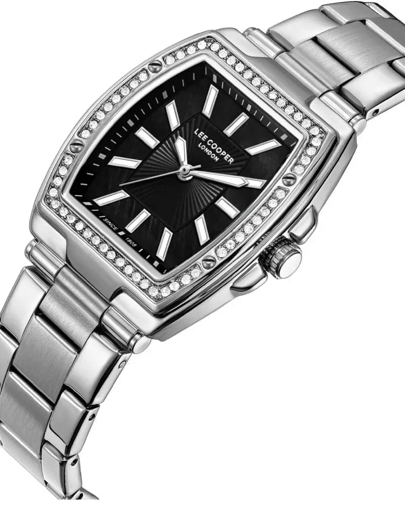 Женские наручные часы Lee Cooper LC08058.350 — это элегантная модель с утончённым дизайном. Корпус диаметром 30 мм выполнен из нержавеющей стали, что придаёт часам изысканный вид. Черный циферблат украшен  изящными кристаллами, а также метками и стрелками с люминесцентным покрытиемЛюминесцентное покрытиеПозволяет считывать показания времени в темноте. Производители наносят на стрелки, часовые индексы, безель или поверхность циферблата светонакопительный состав, дающий холодное свечение., обеспечивая удобное считывание времени. Циферблат защищён минеральным стекломМинеральное стеклоМинеральное стекло представляет собой искусственно выращенный минерал кварца. Такое стекло отличается особой устойчивостью к повреждениям и царапинам. Уступает по некоторым качествам сапфировому стеклу., устойчивым к царапинам.  Минеральное стеклоМинеральное стеклоМинеральное стекло представляет собой искусственно выращенный минерал кварца. Такое стекло отличается особой устойчивостью к повреждениям и царапинам. Уступает по некоторым качествам сапфировому стеклу. более устойчиво к появлению небольших царапин и потертостей, хорошо может выдержать небольшие удары и падения. Часы работают на кварцевом механизме, обеспечивая точность хода. Браслет из нержавеющей стали с раскладной застёжкойРаскладная застёжкаТакой тип застёжки используется только на браслетах из металла. Она никогда не раскрывается полностью, происходит разделение на 2 и более частей. Раскладывающая застёжка снизит вероятность потери часов к минимуму. гарантирует комфортное ношение и надёжную фиксацию на запястье. Водозащита WR30 защищает часы от случайных брызг и дождя, делая их подходящими для повседневного использования.