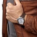 Ремешок из коричневой кожи с застёжкой бабочкойЗастёжка "бабочка"Такой вид застёжки дополняется предохранителями, помогающими избежать случайного раскрытия браслета. Обладают изящным исполнением. и механизмом открытия с кнопками обеспечивает комфортное и надёжное ношение.