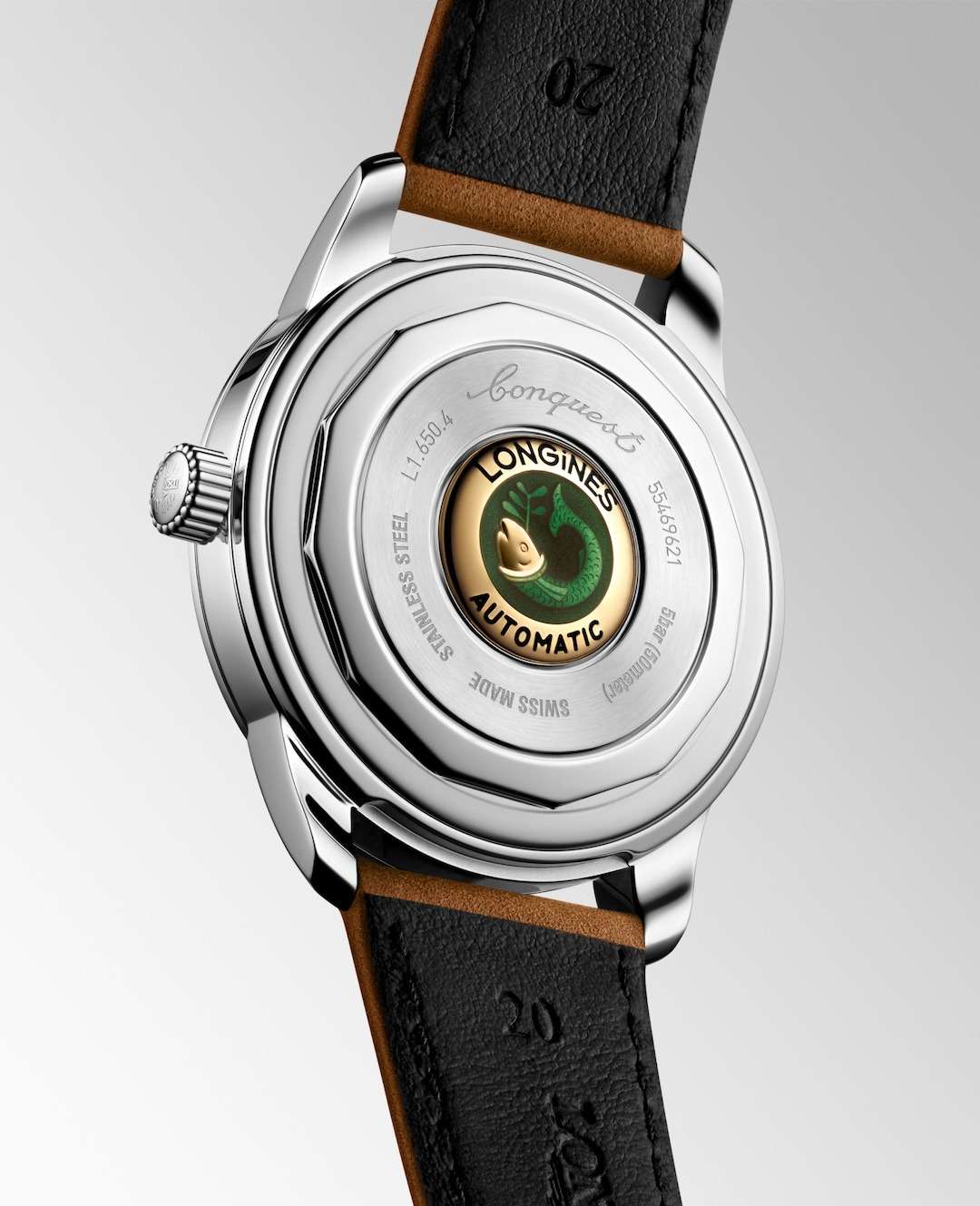 Longines Conquest Heritage L1.650.4.72.2 — это воплощение классической элегантности и швейцарского совершенства, объединяющее в себе богатое наследие марки и современные технологии. Корпус часов выполнен из высококачественной нержавеющей стали диаметром 40 мм и украшен оригинальным медальоном из золота 18 карат с изображением рыбы на задней крышке, что подчеркивает исключительность этой модели. Серебристый циферблат с полированной поверхностью, украшенный изящными накладными индексами в виде штрихов, создает благородный акцент и идеально сочетается с кожаным ремешком коричневого цвета, дополненным надежной стальной застежкой. Также на циферблате располагаются полированные стрелки с люминесцентным покрытиемЛюминесцентное покрытиеПозволяет считывать показания времени в темноте. Производители наносят на стрелки, часовые индексы, безель или поверхность циферблата светонакопительный состав, дающий холодное свечение. Swiss Super-LumiNova для отличной читаемости в любое время суток. Механизм с автоподзаводом калибра L888 обеспечивает точность хода и запас хода до 72 часов, а устойчивость к магнитным полям гарантирует стабильную работу даже в насыщенных электромагнитных условиях. Сапфировое стеклоСапфировое стеклоПрочный и надёжный материал из кристалла сапфира синтетического происхождения, характеризующийся особой твёрдостью и устойчивостью к царапинам и повреждениям. с двусторонним многослойным антибликовым покрытием надежно защищает циферблат от царапин и бликов, сохраняя безупречный внешний вид на долгие годы. Часы выдерживают давление до 5 бар (50 метров), что позволяет не снимать их во время мытья рук или прогулок под дождем. Завинчивающаяся заводная головка и продуманная конструкция корпуса подчеркивают высокий уровень исполнения каждой детали.