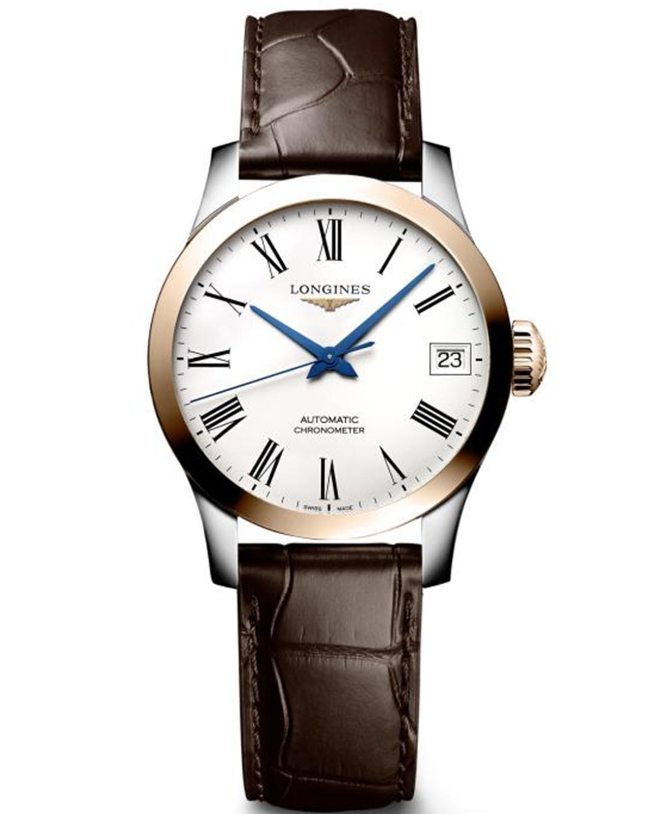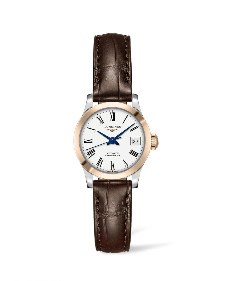 Женские швейцарские механические часы Longines Record Collection L2.320.5.11.2 – аксессуар в классическом стиле. Швейцарский автоматический механизм L592.4 с резервом хода до 45 часов за высокую точность хода отмечен официальным сертификатом хронометра COSCСертификат COSCОфициальный сертификат, подтверждающий то, что часы ходят с особо высокой точностью. Для получения документа часы подвергаются тестовым испытаниям, разработанным швейцарским институтом тестирования хронометров COSC. Допустимая норма для механических часов -4/+6 секунд в день, для кварцевых моделей +/- 0,07 секунд в день.. Сапфировое стеклоСапфировое стеклоПрочный и надёжный материал из кристалла сапфира синтетического происхождения, характеризующийся особой твёрдостью и устойчивостью к царапинам и повреждениям. дополнено антибликовым покрытиемАнтибликовое покрытиеСлой оксида металла в 0,13-0,3 микрон, благодаря которому стекло часов не бликует и не отражает свет. Антибликовое покрытие уменьшает отражение света в 10 раз, обеспечивая отличную читаемость показателей циферблата.. БезельБезельВнешний ободок, закрепляющий стекло. В спортивных часах так называется поворотное кольцо с делениями на циферблате, выполняет роль таймера – замеряет отрезки времени на шкале. Неподвижный безель – элемент декора. Однонаправленно вращающийся безель на дайверских часах позволяет фиксировать моменты погружения и выныривания на поверхность. из 18-ти каратного золота18-каратное золотоОбозначение по каратной системе пробирования, оно показывает, сколько драгоценного металла содержится в изделии. 18 карат - в составе 75% чистого золота, соответствует 750 пробе.