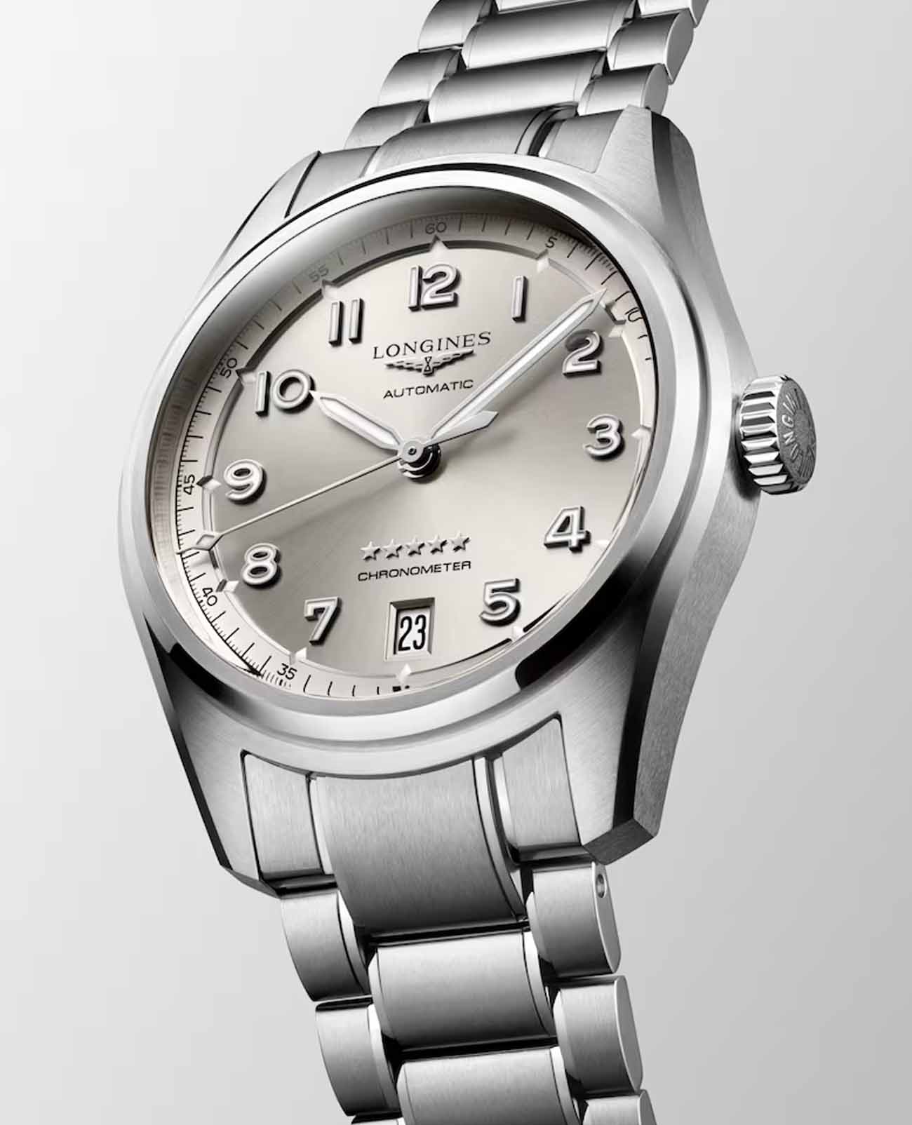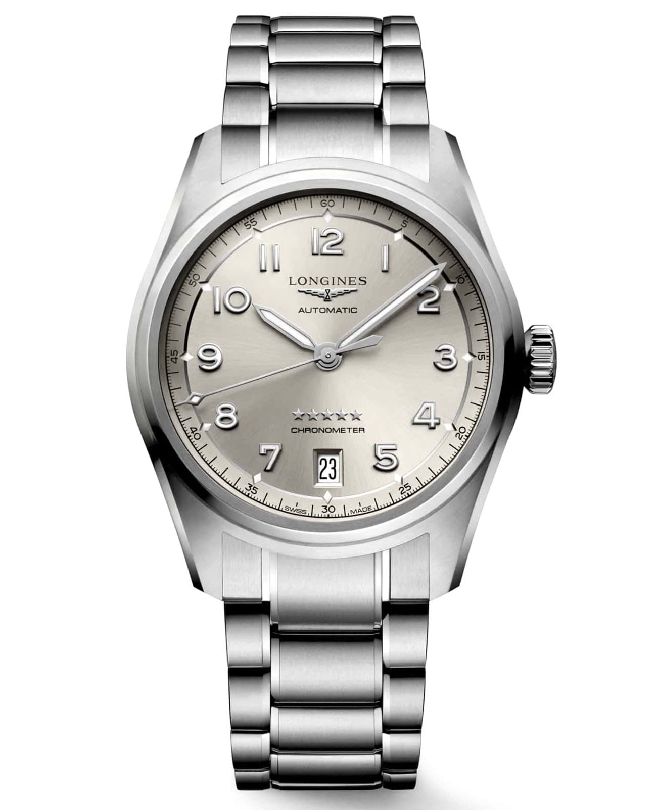 Швейцарские механические часы Longines Spirit L3.410.4.63.6 – высокоточный хронометр в стильном дизайне. Автоматический механизм с частотой баланса 25 200 полуколебаний в час и монокристаллической кремниевой спиралью баланса, обеспечивающей запас хода ок. 72 часов, сертифицирован COSCСертификат COSCОфициальный сертификат, подтверждающий то, что часы ходят с особо высокой точностью. Для получения документа часы подвергаются тестовым испытаниям, разработанным швейцарским институтом тестирования хронометров COSC. Допустимая норма для механических часов -4/+6 секунд в день, для кварцевых моделей +/- 0,07 секунд в день.. Дополнительные особенности: сапфировое стеклоСапфировое стеклоПрочный и надёжный материал из кристалла сапфира синтетического происхождения, характеризующийся особой твёрдостью и устойчивостью к царапинам и повреждениям. с двухсторонним антибликовым покрытиемАнтибликовое покрытиеСлой оксида металла в 0,13-0,3 микрон, благодаря которому стекло часов не бликует и не отражает свет. Антибликовое покрытие уменьшает отражение света в 10 раз, обеспечивая отличную читаемость показателей циферблата., люминесцентная подсветкаЛюминесцентное покрытиеПозволяет считывать показания времени в темноте. Производители наносят на стрелки, часовые индексы, безель или поверхность циферблата светонакопительный состав, дающий холодное свечение.. Окошко даты в положении 6 часов. Стрелки и метки с люминесцентнымЛюминесцентное покрытиеПозволяет считывать показания времени в темноте. Производители наносят на стрелки, часовые индексы, безель или поверхность циферблата светонакопительный состав, дающий холодное свечение. покрытием. Класс водозащиты: 100 метров, позволит плавать, нырять и заниматься другими водными видами спорта. Стальной браслет на застёжке «бабочка» с кнопкамиЗастёжка "бабочка"Такой вид застёжки дополняется предохранителями, помогающими избежать случайного раскрытия браслета. Обладают изящным исполнением. .