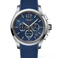 Синий ремешок из каучука стильно смотрится на запястье. Швейцарский кварцевый механизм L289 демонстрирует абсолютную точность хода. Устойчивое к царапинам сапфировое стекло имеет антибликовое покрытиеАнтибликовое покрытиеСлой оксида металла в 0,13-0,3 микрон, благодаря которому стекло часов не бликует и не отражает свет. Антибликовое покрытие уменьшает отражение света в 10 раз, обеспечивая отличную читаемость показателей циферблата.. Функции: вечный календарь, индикатор EOLEOLПредставляет собой систему, уведомляющую владельца часов о необходимости замены элемента питания. За 2 недели до полного разряда батарейки секундная стрелка перестаёт ходить чётко и начинает перепрыгивать на 3-4 деления., хронограф.