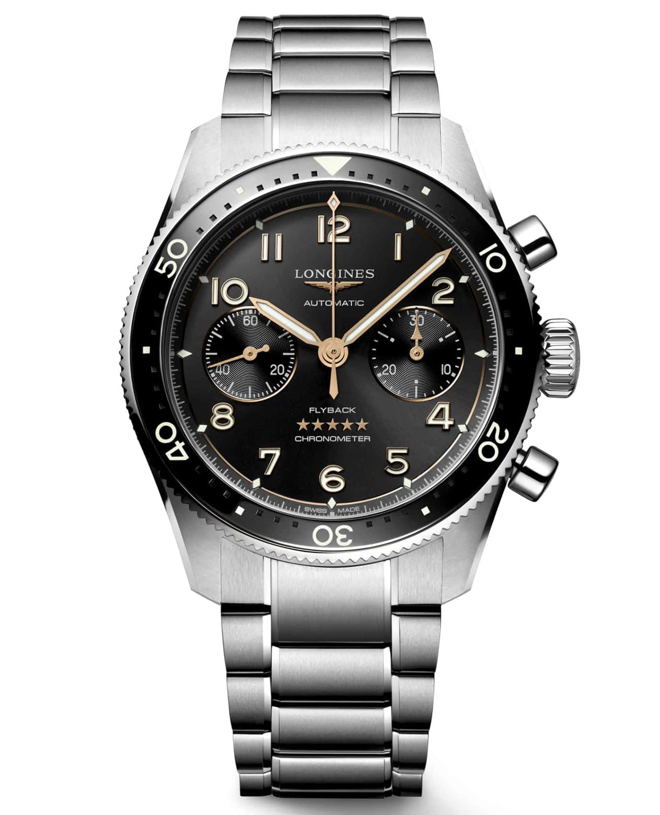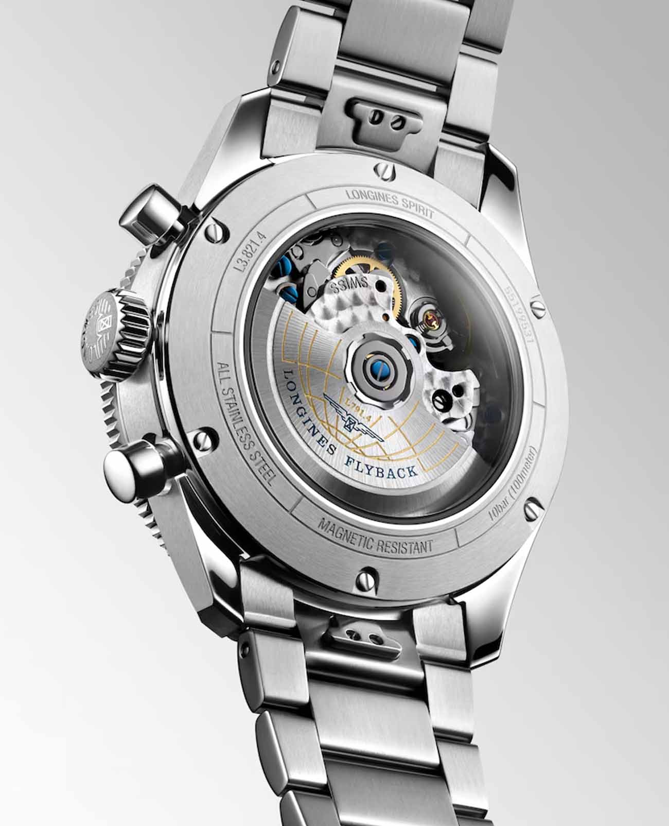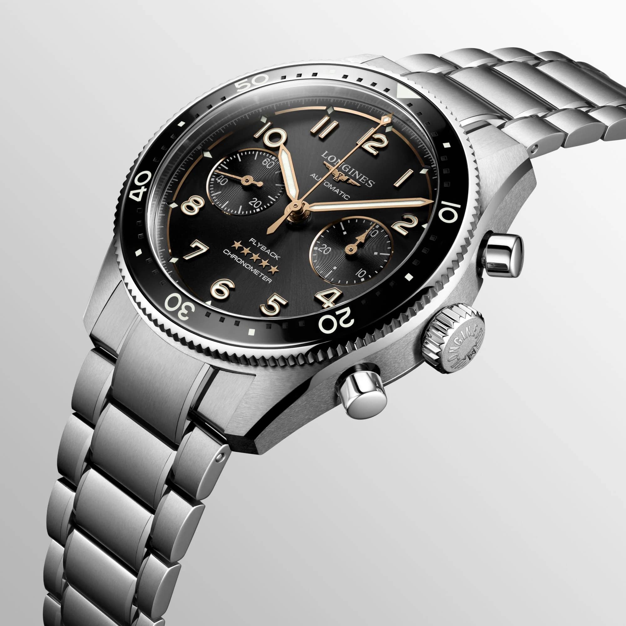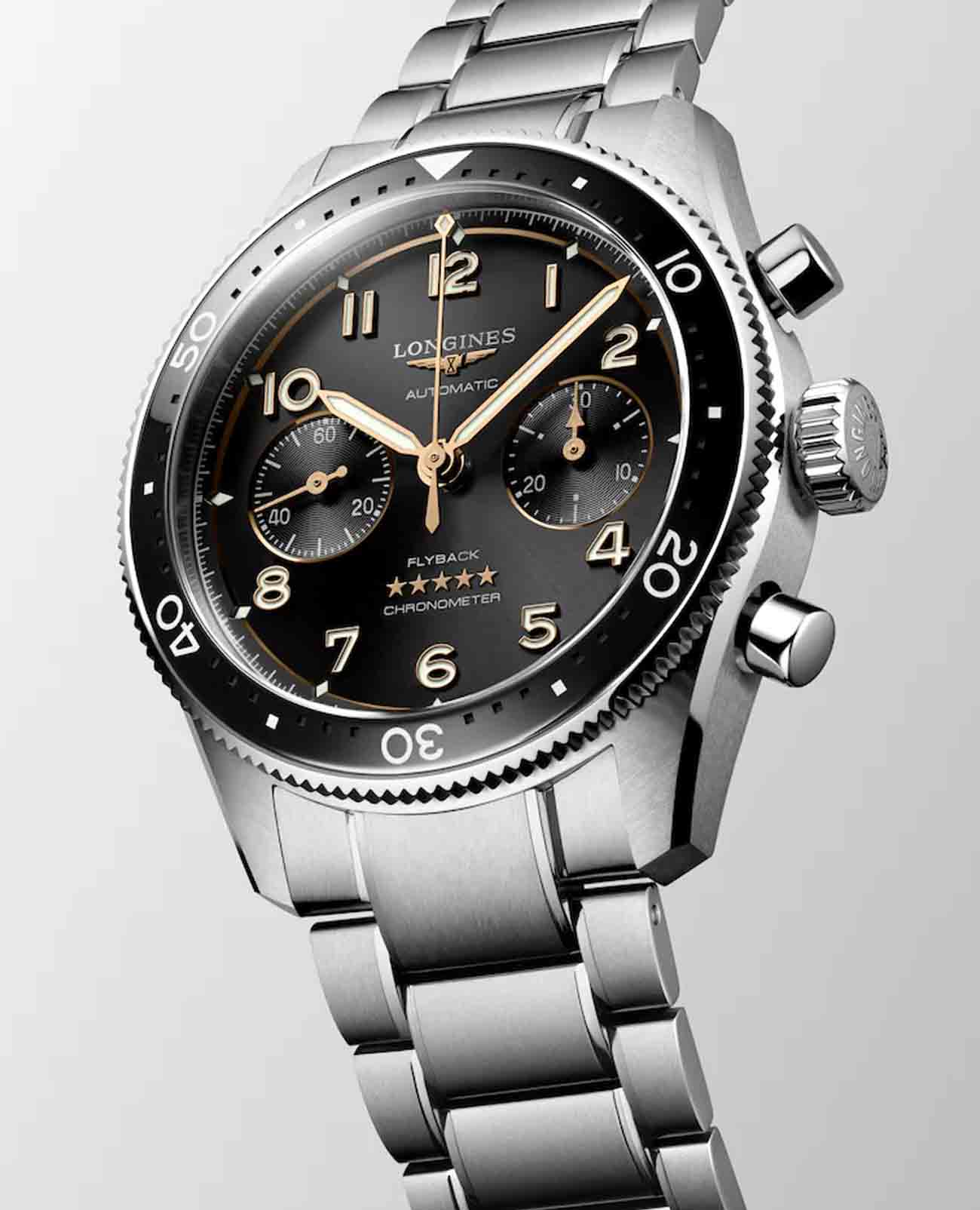 Мужские швейцарские механические часы Longines Spirit Flyback L3.821.4.53.6 – высокоточный хронометр в стильном дизайне. Спортивный хронографХронографФункция позволяет измерять отрезки времени с особой точностью: часы, минуты, секунды. Верным признаком хронографа является наличие на циферблате 3 дополнительных окошек-счётчиков. выпущен в честь известных авиаторов, которые раньше тестировали часы Longines. Модель оснащена швейцарским автоматическим механизмом, чрезвычайно точный механизм с запасом хода 68 часов сертифицирован COSCСертификат COSCОфициальный сертификат, подтверждающий то, что часы ходят с особо высокой точностью. Для получения документа часы подвергаются тестовым испытаниям, разработанным швейцарским институтом тестирования хронометров COSC. Допустимая норма для механических часов -4/+6 секунд в день, для кварцевых моделей +/- 0,07 секунд в день.. Дополнительные особенности: сапфировое стеклоСапфировое стеклоПрочный и надёжный материал из кристалла сапфира синтетического происхождения, характеризующийся особой твёрдостью и устойчивостью к царапинам и повреждениям. с двухсторонним антибликовым покрытиемАнтибликовое покрытиеСлой оксида металла в 0,13-0,3 микрон, благодаря которому стекло часов не бликует и не отражает свет. Антибликовое покрытие уменьшает отражение света в 10 раз, обеспечивая отличную читаемость показателей циферблата., люминесцентная подсветкаЛюминесцентное покрытиеПозволяет считывать показания времени в темноте. Производители наносят на стрелки, часовые индексы, безель или поверхность циферблата светонакопительный состав, дающий холодное свечение.. Часы, минуты, малая секундная стрелка в положении 9 часов. Он оснащен двунаправленным безелемБезельВнешний ободок, закрепляющий стекло. В спортивных часах так называется поворотное кольцо с делениями на циферблате, выполняет роль таймера – замеряет отрезки времени на шкале. Неподвижный безель – элемент декора. Однонаправленно вращающийся безель на дайверских часах позволяет фиксировать моменты погружения и выныривания на поверхность., дополненным керамической вставкой с люминесцентнымЛюминесцентное покрытиеПозволяет считывать показания времени в темноте. Производители наносят на стрелки, часовые индексы, безель или поверхность циферблата светонакопительный состав, дающий холодное свечение. метками и циферблатом в виде солнечных лучей. Класс водозащиты: 100 метров, позволит плавать, нырять и заниматься другими водными видами спорта. Стальной браслет на раскладной застёжкеРаскладная застёжкаТакой тип застёжки используется только на браслетах из металла. Она никогда не раскрывается полностью, происходит разделение на 2 и более частей. Раскладывающая застёжка снизит вероятность потери часов к минимуму.