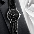 Нет ничего лишнего: лаконичные метки и стрелки, чёрный матовый циферблат, минималистичный стальной корпус, ремешок из натуральной кожи. Безупречная точность хода достигается за счёт швейцарского автоматического калибра L888 с 64-часовым запасом хода. Стильно смотрится прозрачная задняя крышка. Сапфировое стекло отличается устойчивостью к царапинам.