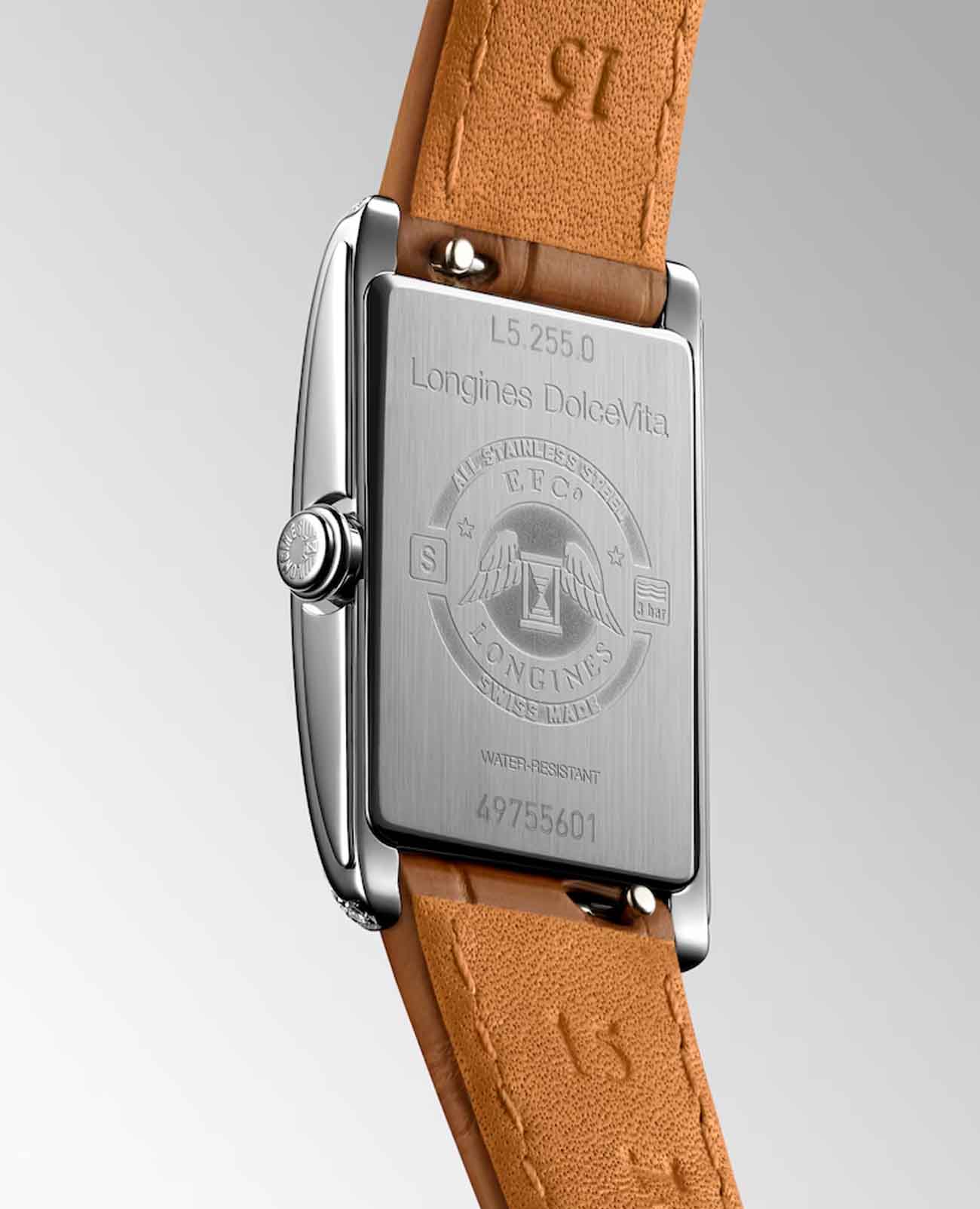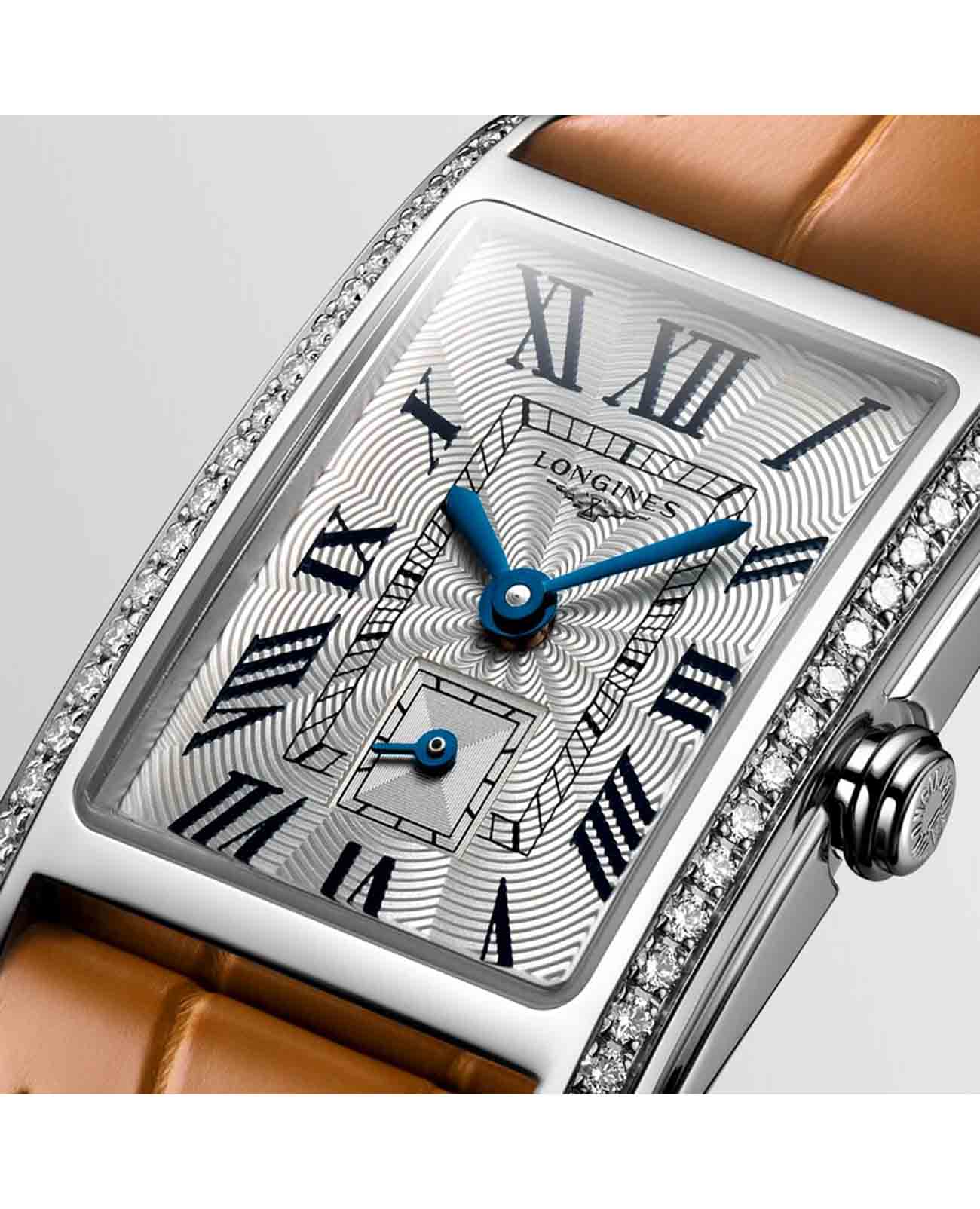 Женские швейцарские часы Longines DolceVita L5.255.0.71.4, кварцевый механизм с высокой точностью. Сапфировое стеклоСапфировое стеклоПрочный и надёжный материал из кристалла сапфира синтетического происхождения, характеризующийся особой твёрдостью и устойчивостью к царапинам и повреждениям. устойчивое к появлению царапин, обладающее высокой прозрачностью. Корпусиз нержавеющей стали с 46 бриллиантами группы Top Wesselton IF-VVS общим весом 0.386 карата. Циферблат украшен римскими цифрами. Малая секундная стрелка в положении 6 часов. Класс водозащиты: 30 метров, позволит защитить корпус от случайных брызг или капель дождя. Ремешок из кожи аллигатора на стандартной застежке.