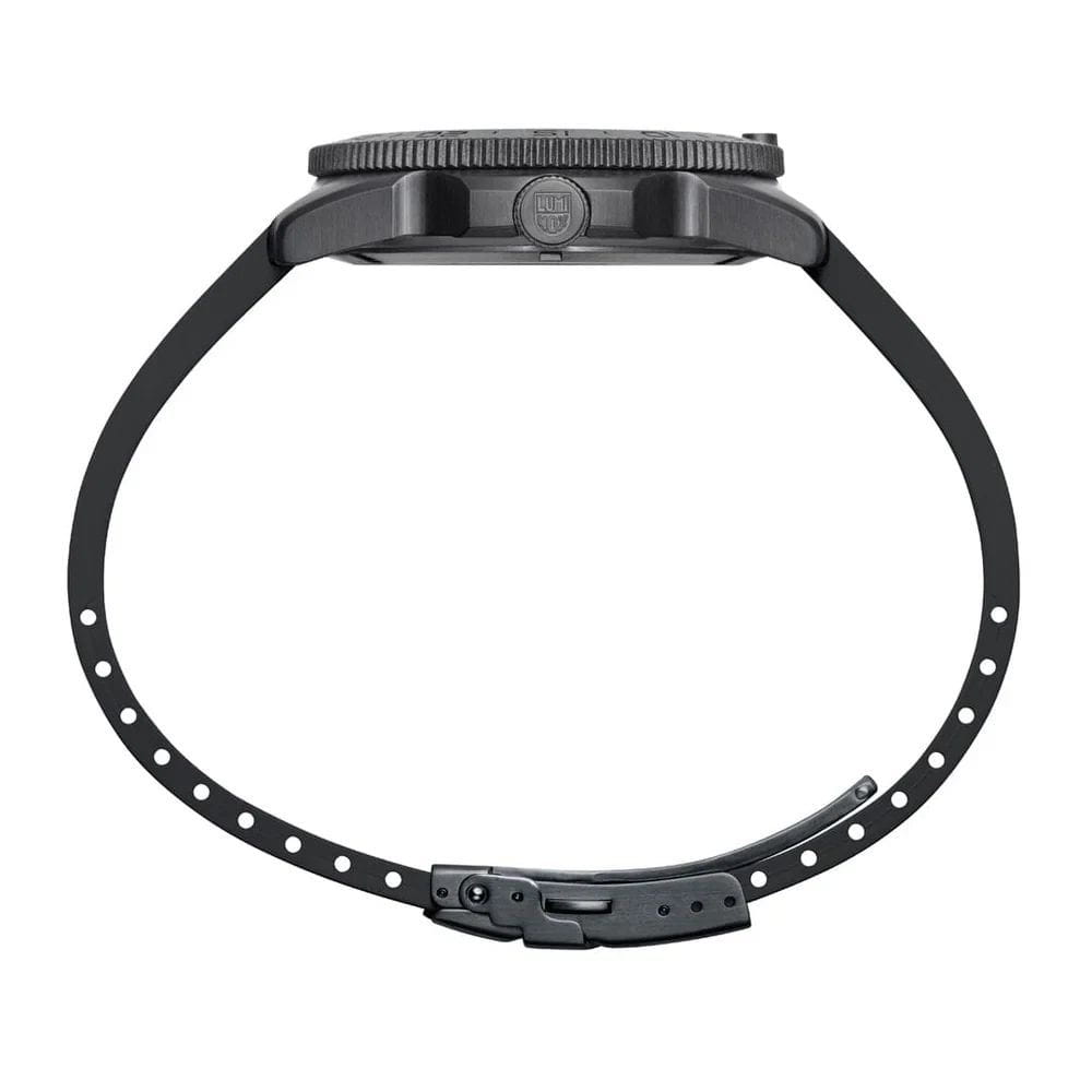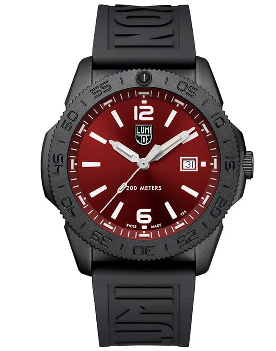 Luminox XS.3135.B — мужская модель серии Pacific Diver, сочетающая надёжность дайверских часов и современный стиль. Корпус диаметром 44 мм выполнен из нержавеющей стали с чёрным PVDPVDУльтратонкое покрытие наносится в технике вакуумного напыления, сочетает в себе нитрид титана особой прочности со слоем золота или оксида хрома. Несёт в себе декоративную или защитную функцию.-покрытием, а односторонний вращающийся безельБезельВнешний ободок, закрепляющий стекло. В спортивных часах так называется поворотное кольцо с делениями на циферблате, выполняет роль таймера – замеряет отрезки времени на шкале. Неподвижный безель – элемент декора. Однонаправленно вращающийся безель на дайверских часах позволяет фиксировать моменты погружения и выныривания на поверхность. из углеродного композита отличается прочностью и лёгкостью. Защитную функцию выполняет сапфировое стеклоСапфировое стеклоПрочный и надёжный материал из кристалла сапфира синтетического происхождения, характеризующийся особой твёрдостью и устойчивостью к царапинам и повреждениям. с антибликовым покрытиемАнтибликовое покрытиеСлой оксида металла в 0,13-0,3 микрон, благодаря которому стекло часов не бликует и не отражает свет. Антибликовое покрытие уменьшает отражение света в 10 раз, обеспечивая отличную читаемость показателей циферблата., обеспечивающим чёткую читаемость в любых условиях. Механизм — швейцарский кварцевый, с индикацией часов, минут, секунд и даты. Водозащита 200 м (20 бар) соответствует профессиональным стандартам для дайвинга. Метки и стрелки покрыты люминесцентным покрытиемЛюминесцентное покрытиеПозволяет считывать показания времени в темноте. Производители наносят на стрелки, часовые индексы, безель или поверхность циферблата светонакопительный состав, дающий холодное свечение. и дополнены системой Luminox Light Technology, которая обеспечивает постоянную подсветку до 25 лет без подзарядки. Модель укомплектована каучуковым ремешком с классической застёжкой, который подчёркивает спортивный характер и удобство при активном использовании.