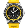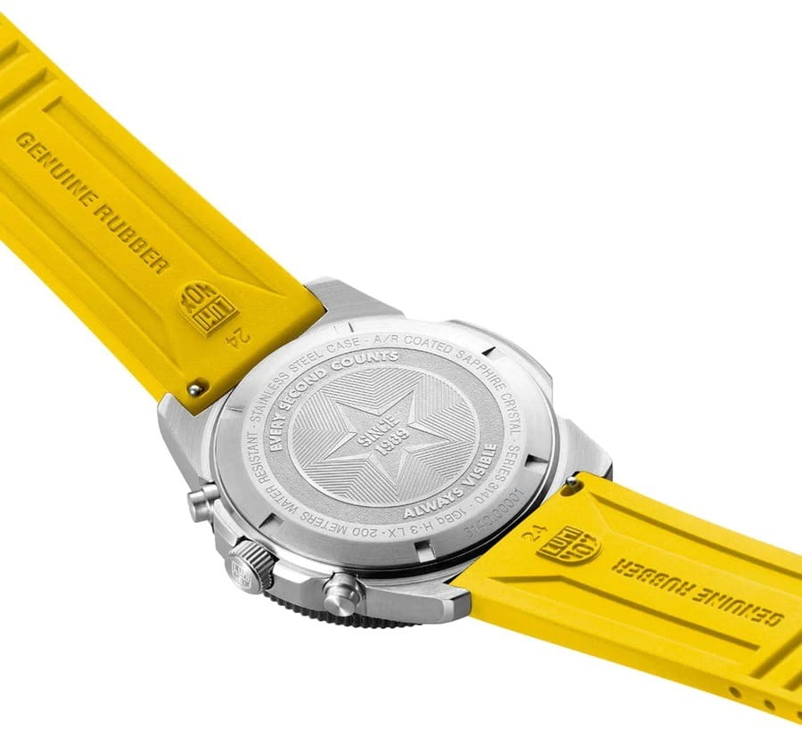 Швейцарские наручные часы Luminox Pacific Diver Chronograph XS.3145 – это идеальный симбиоз стиля и высокой функциональности. Оснащенные высокоточным кварцевым механизмом, они гарантируют безупречное времяизмерение и надежность в любом случае. Часы-хронографХронографФункция позволяет измерять отрезки времени с особой точностью: часы, минуты, секунды. Верным признаком хронографа является наличие на циферблате 3 дополнительных окошек-счётчиков. обладают функцией секундомераСекундомерСекундоме́р — прибор, способный измерять интервалы времени с точностью до долей секунды., что делает их практичными в использовании. Циферблат этих часов защищен сапфировым стекломСапфировое стеклоПрочный и надёжный материал из кристалла сапфира синтетического происхождения, характеризующийся особой твёрдостью и устойчивостью к царапинам и повреждениям. с антибликовым покрытиемАнтибликовое покрытиеСлой оксида металла в 0,13-0,3 микрон, благодаря которому стекло часов не бликует и не отражает свет. Антибликовое покрытие уменьшает отражение света в 10 раз, обеспечивая отличную читаемость показателей циферблата., которое славится своей прочностью и устойчивостью к царапинам, обеспечивая кристально чистый обзор. Корпус часов выполнен из качественной стали, что свидетельствует о долговечности и прочности изделия. Стрелки с LLTLLTLLT — это автономный механизм подсветки, основанный на использовании микроскопических газонаполненных элементов. Специальные герметичные капсулы из боросиликатного стекла, интегрированные в циферблат, генерируют свечение без необходимости подключения к внешним источникам энергии. Для их работы не требуется ни дополнительный свет, ни механическое воздействие (например, нажатие кнопки). Свечение возникает благодаря химическому процессу: реакция между тритием, заключенным в капсулах, и люминофорным покрытием создает стабильное автономное освещение. Технология обеспечивает энергетическую независимость и долговечность подсветки.-подсветкой, обеспечивают отличную видимость даже в условиях недостаточной освещенности, что делает их удобными для использования в любых условиях. Дополнительно часы располагают окошком даты в положении 4 часа, позволяющим быстро и удобно отслеживать текущую дату. Их внушительный класс водозащиты в 200 метров делает их идеальными для любителей водных видов спорта, таких как плавание и ныряние, не беспокоясь о повреждении механизма. Каучуковый ремешок желтого, надёжно фиксирующий часы на запястье с помощью раскладной застёжкиРаскладная застёжкаТакой тип застёжки используется только на браслетах из металла. Она никогда не раскрывается полностью, происходит разделение на 2 и более частей. Раскладывающая застёжка снизит вероятность потери часов к минимуму., обеспечивает комфортное ношение в течение всего дня. Стильный вращающийся безельБезельВнешний ободок, закрепляющий стекло. В спортивных часах так называется поворотное кольцо с делениями на циферблате, выполняет роль таймера – замеряет отрезки времени на шкале. Неподвижный безель – элемент декора. Однонаправленно вращающийся безель на дайверских часах позволяет фиксировать моменты погружения и выныривания на поверхность., изготовленный из карбонаКарбонОт «carbon», «carbone» - углерод, углепластик - полимерный композиционный материал из п