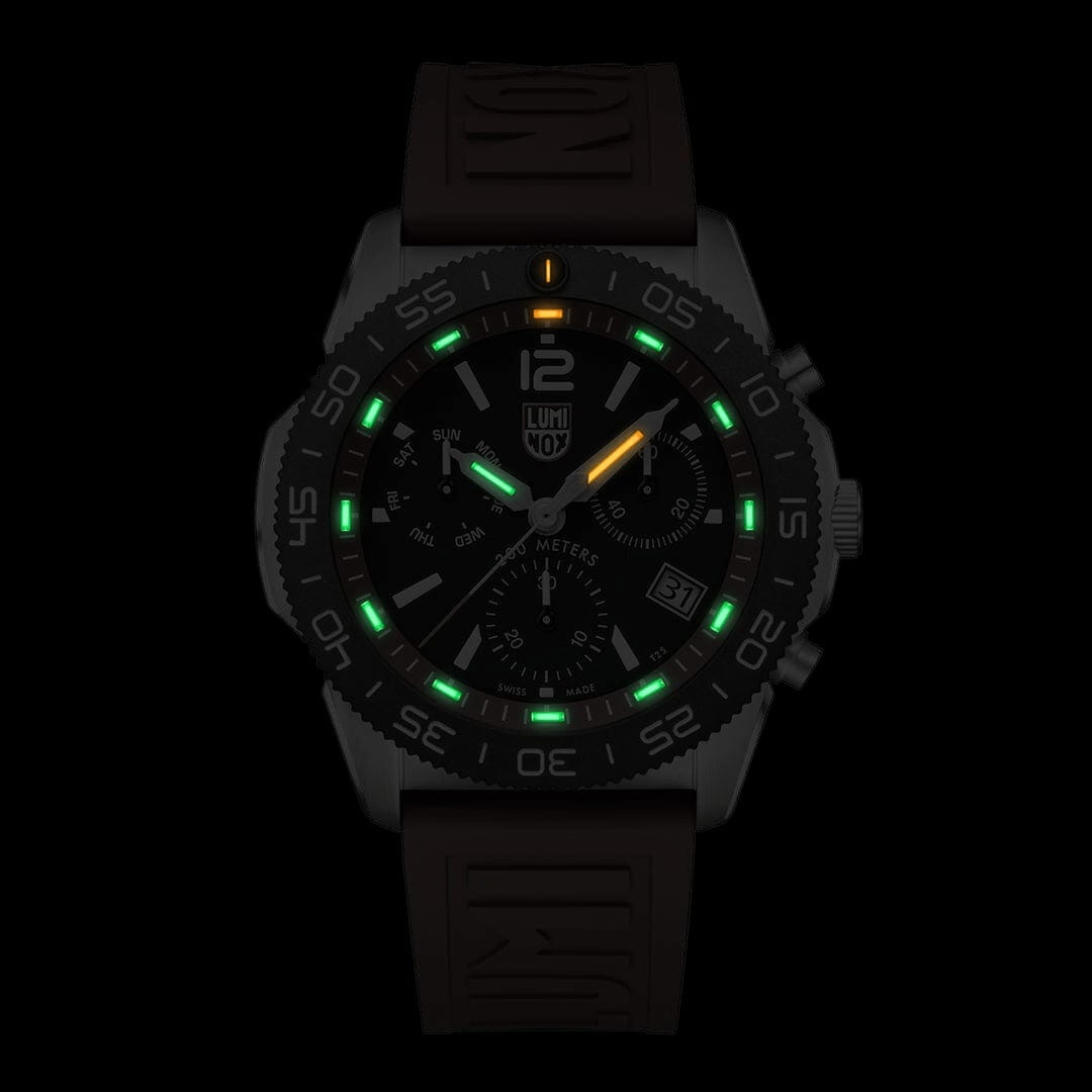 Швейцарские наручные часы Luminox Pacific Diver Chronograph XS.3155.SET – это идеальный симбиоз стиля и высокой функциональности. Оснащенные высокоточным кварцевым механизмом, они гарантируют безупречное времяизмерение и надежность в любом случае. Часы-хронографХронографФункция позволяет измерять отрезки времени с особой точностью: часы, минуты, секунды. Верным признаком хронографа является наличие на циферблате 3 дополнительных окошек-счётчиков. обладают функцией секундомераСекундомерСекундоме́р — прибор, способный измерять интервалы времени с точностью до долей секунды., что делает их практичными в использовании. Циферблат этих часов защищен сапфировым стекломСапфировое стеклоПрочный и надёжный материал из кристалла сапфира синтетического происхождения, характеризующийся особой твёрдостью и устойчивостью к царапинам и повреждениям. с антибликовым покрытиемАнтибликовое покрытиеСлой оксида металла в 0,13-0,3 микрон, благодаря которому стекло часов не бликует и не отражает свет. Антибликовое покрытие уменьшает отражение света в 10 раз, обеспечивая отличную читаемость показателей циферблата., которое славится своей прочностью и устойчивостью к царапинам, обеспечивая кристально чистый обзор. Корпус часов выполнен из качественной стали, что свидетельствует о долговечности и прочности изделия. Стрелки с LLTLLTLLT — это автономный механизм подсветки, основанный на использовании микроскопических газонаполненных элементов. Специальные герметичные капсулы из боросиликатного стекла, интегрированные в циферблат, генерируют свечение без необходимости подключения к внешним источникам энергии. Для их работы не требуется ни дополнительный свет, ни механическое воздействие (например, нажатие кнопки). Свечение возникает благодаря химическому процессу: реакция между тритием, заключенным в капсулах, и люминофорным покрытием создает стабильное автономное освещение. Технология обеспечивает энергетическую независимость и долговечность подсветки.-подсветкой, обеспечивают отличную видимость даже в условиях недостаточной освещенности, что делает их удобными для использования в любых условиях. Дополнительно часы располагают окошком даты в положении 4 часа, позволяющим быстро и удобно отслеживать текущую дату. Их внушительный класс водозащиты в 200 метров делает их идеальными для любителей водных видов спорта, таких как плавание и ныряние, не беспокоясь о повреждении механизма. Каучуковый красный ремешок, надёжно фиксирующий часы на запястье с помощью раскладной застёжкиРаскладная застёжкаТакой тип застёжки используется только на браслетах из металла. Она никогда не раскрывается полностью, происходит разделение на 2 и более частей. Раскладывающая застёжка снизит вероятность потери часов к минимуму., обеспечивает комфортное ношение в течение всего дня. Стильный вращающийся безельБезельВнешний ободок, закрепляющий стекло. В спортивных часах так называется поворотное кольцо с делениями на циферблате, выполняет роль таймера – замеряет отрезки времени на шкале. Неподвижный безель – элемент декора. Однонаправленно вращающийся безель на дайверских часах позволяет фиксировать моменты погружения и выныривания на поверхность., изготовленный из карбонаКарбонОт «carbon», «carbone» - углерод, углепластик - полимерный композиционный материал из