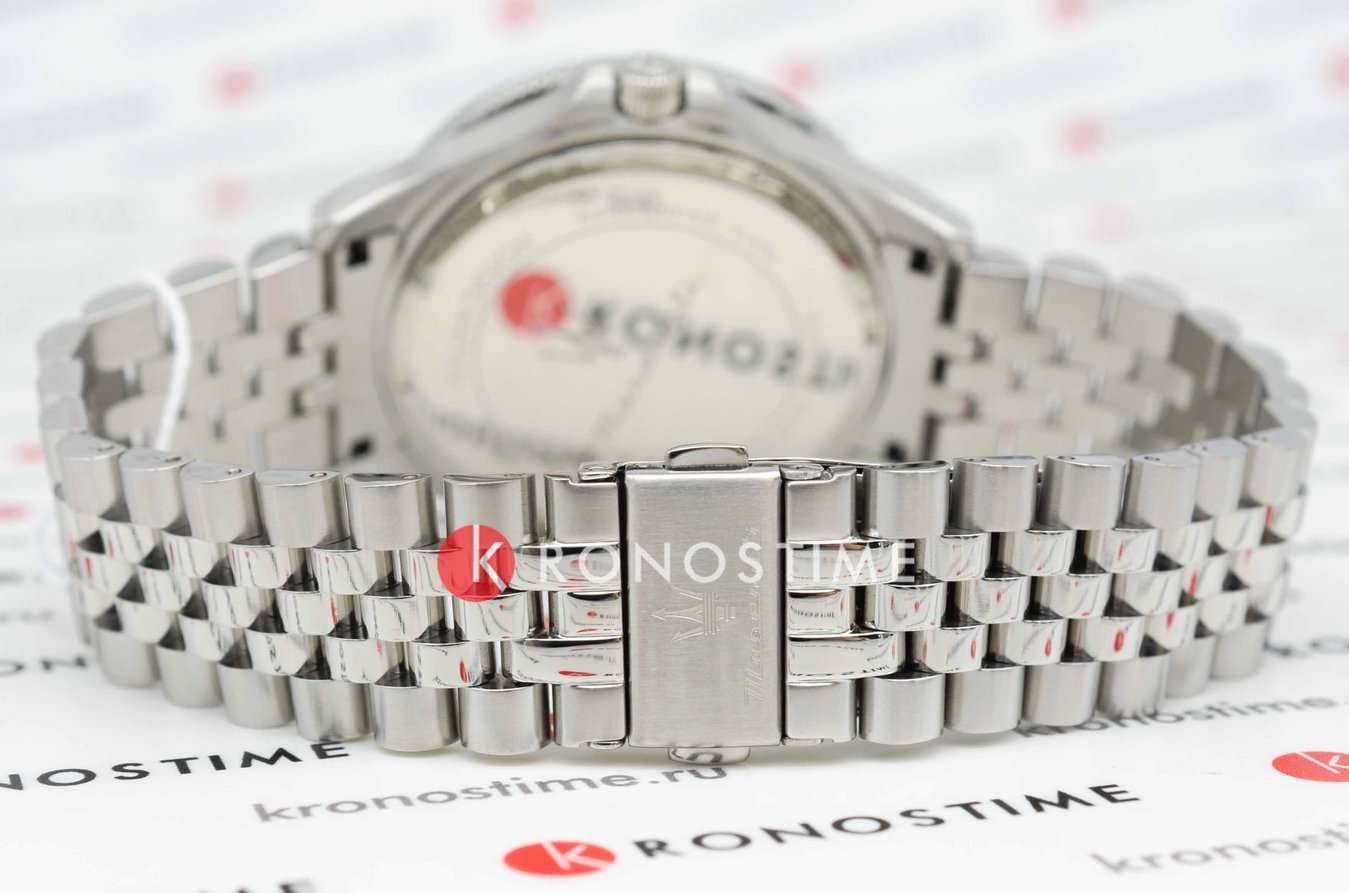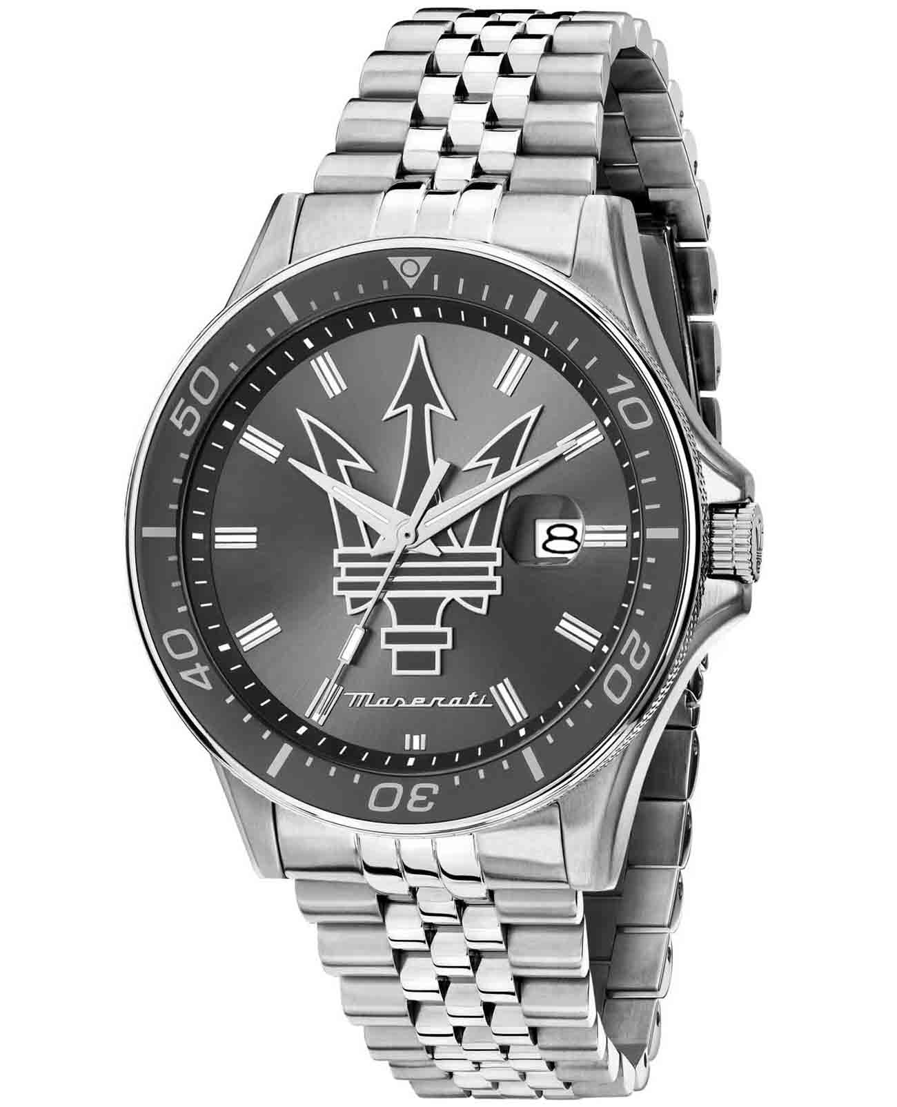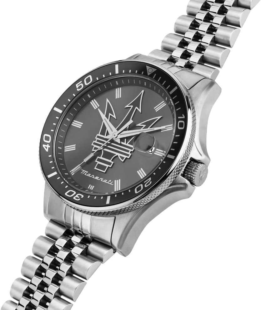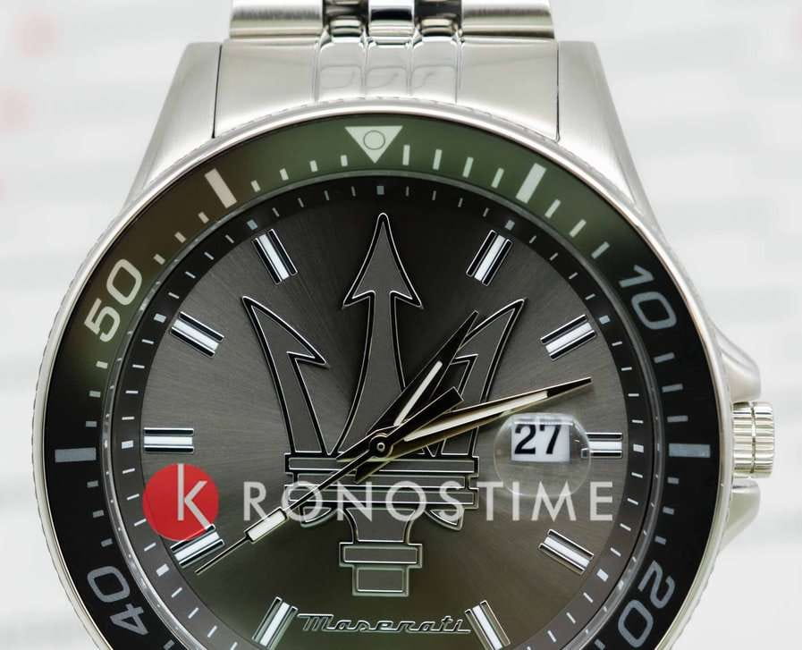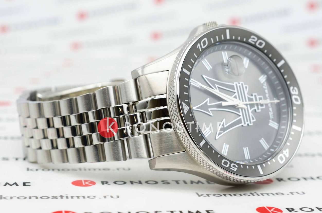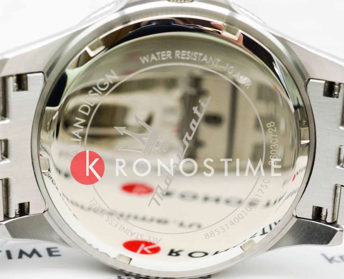 Модель Maserati Sfida R8853140010 — воплощение стиля и функциональности для современных мужчин, ценящих качество и элегантность. Корпус диаметром 44 мм выполнен из нержавеющей стали, обеспечивая прочность и долговечность. Минеральное стеклоМинеральное стеклоМинеральное стекло представляет собой искусственно выращенный минерал кварца. Такое стекло отличается особой устойчивостью к повреждениям и царапинам. Уступает по некоторым качествам сапфировому стеклу. надежно защищает синий циферблат с изящными рисками, придавая часам утонченный вид. Благодаря водостойкости до 100 метров (10 АТМ), эти часы станут вашим надежным спутником в любых условиях, будь то деловая встреча или активный отдых. Люминесцентное покрытиеЛюминесцентное покрытиеПозволяет считывать показания времени в темноте. Производители наносят на стрелки, часовые индексы, безель или поверхность циферблата светонакопительный состав, дающий холодное свечение. на стрелках и метках обеспечивает отличную видимость в темноте. Завершающий штрих — стальной браслет с раскладной застёжкойРаскладная застёжкаТакой тип застёжки используется только на браслетах из металла. Она никогда не раскрывается полностью, происходит разделение на 2 и более частей. Раскладывающая застёжка снизит вероятность потери часов к минимуму., который подчеркивает общий стиль, обеспечивая комфорт и надежность в носке. Вращающийся стальной безельБезельВнешний ободок, закрепляющий стекло. В спортивных часах так называется поворотное кольцо с делениями на циферблате, выполняет роль таймера – замеряет отрезки времени на шкале. Неподвижный безель – элемент декора. Однонаправленно вращающийся безель на дайверских часах позволяет фиксировать моменты погружения и выныривания на поверхность. с IP-покрытиемIP-покрытиеМетод ионного напыления. Демонстрирует повышенную устойчивость к истиранию, окислению и химическим веществам. Под воздействием высокого давления и температуры около 1500°C молекулы металла надёжно соединяются с частицами корпуса часов..  Циферблат выполнен по технологии Sunray (солнечные лучи) и украшен фирменным логотипом «Maserati». Метки в виде штрихов. Окошко даты с увеличительным стеклом находится в положении 3 часа.