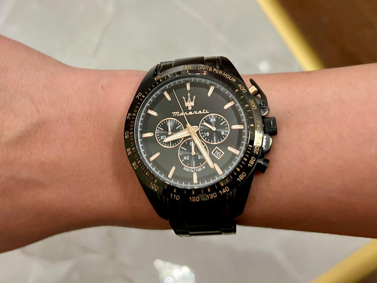 Мужские наручные часы-хронографХронографФункция позволяет измерять отрезки времени с особой точностью: часы, минуты, секунды. Верным признаком хронографа является наличие на циферблате 3 дополнительных окошек-счётчиков. Maserati R8873612048, кварцевый механизм (автоматический калибр) с высокой точностью. Минеральное стеклоМинеральное стеклоМинеральное стекло представляет собой искусственно выращенный минерал кварца. Такое стекло отличается особой устойчивостью к повреждениям и царапинам. Уступает по некоторым качествам сапфировому стеклу. устойчивое к появлению царапин, обладающее высокой прозрачностью. Стрелки с люминесцентным покрытиемЛюминесцентное покрытиеПозволяет считывать показания времени в темноте. Производители наносят на стрелки, часовые индексы, безель или поверхность циферблата светонакопительный состав, дающий холодное свечение.. Класс водозащиты: 100 метров, позволит плавать, нырять и заниматься другими водными видами спорта. Корпус часов изготовлен из нержавеющей стали с PVD-покрытиемPVDУльтратонкое покрытие наносится в технике вакуумного напыления, сочетает в себе нитрид титана особой прочности со слоем золота или оксида хрома. Несёт в себе декоративную или защитную функцию.. Браслет с раскладной застёжкойРаскладная застёжкаТакой тип застёжки используется только на браслетах из металла. Она никогда не раскрывается полностью, происходит разделение на 2 и более частей. Раскладывающая застёжка снизит вероятность потери часов к минимуму. и с PVD-покрытиемPVDУльтратонкое покрытие наносится в технике вакуумного напыления, сочетает в себе нитрид титана особой прочности со слоем золота или оксида хрома. Несёт в себе декоративную или защитную функцию..