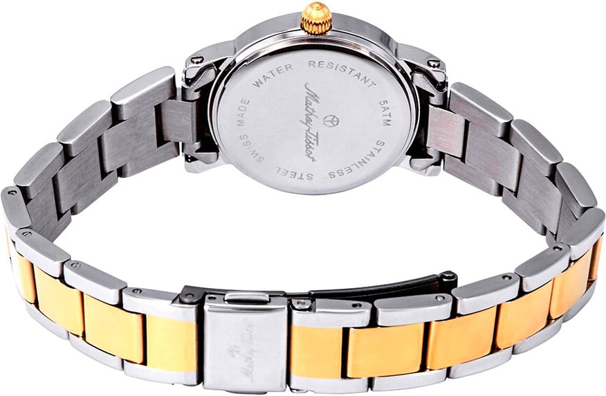 Женские кварцевые часы Mathey-Tissot City Metal D31186MBI — это стильное сочетание элегантности и современного дизайна. Изящный корпус выполнен из стали 316L с безелемБезельВнешний ободок, закрепляющий стекло. В спортивных часах так называется поворотное кольцо с делениями на циферблате, выполняет роль таймера – замеряет отрезки времени на шкале. Неподвижный безель – элемент декора. Однонаправленно вращающийся безель на дайверских часах позволяет фиксировать моменты погружения и выныривания на поверхность. с PVD-покрытиемPVDУльтратонкое покрытие наносится в технике вакуумного напыления, сочетает в себе нитрид титана особой прочности со слоем золота или оксида хрома. Несёт в себе декоративную или защитную функцию., что придаст образу женственности и романтизма. Изысканный циферблат с метками в виде штрихов придает модели особый блеск и защищен минеральным стекломМинеральное стеклоМинеральное стекло представляет собой искусственно выращенный минерал кварца. Такое стекло отличается особой устойчивостью к повреждениям и царапинам. Уступает по некоторым качествам сапфировому стеклу. с сапфировым покрытием, обеспечивающим устойчивость к царапинам. Центральные часовая, минутная стрелки. Часы оснащены надежным кварцевым механизмом. Окошко даты находится в положении 3 часа. Стальной браслет с частичным PVD-покрытиемPVDУльтратонкое покрытие наносится в технике вакуумного напыления, сочетает в себе нитрид титана особой прочности со слоем золота или оксида хрома. Несёт в себе декоративную или защитную функцию. на раскладной застёжкеРаскладная застёжкаТакой тип застёжки используется только на браслетах из металла. Она никогда не раскрывается полностью, происходит разделение на 2 и более частей. Раскладывающая застёжка снизит вероятность потери часов к минимуму., гарантирующего комфортное и безопасное ношение. Класс водозащиты: 30 метров позволит защитить корпус от случайных брызг или капель дождя. Mathey-Tissot — отличный выбор для тех, кто ценит утонченность и качество.